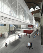 The structure of the insertion is entirely autonomous, producing a series of ramped gallery spaces that fill the old building yet barely seem to touch the ground. The arched cast-iron trusses of the nineteenth-century pavilion are subtly reinterpreted in the glass facades and truss system of the bridges and ramps in the new volume. The upper levels of the ramps offer a view up to the iron lattices and wooden beams of the soaring ceiling of the original building and down to the nested gallery spaces. The expansion also includes auditoriums in a below-grade excavation and a library near the roof.