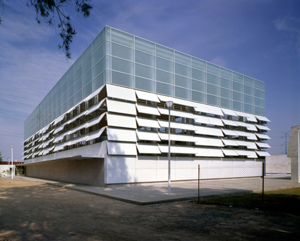 The bold, simple prism is clad with operable white metallic panels that are automatically activated by climatic changes - temperature, wind, rain and so on - enabling the building to "breathe" and adjust to environmental conditions. The upper part of this volume is wrapped by a membrane of frosted-glass panels which filters and controls the quality of the natural light. This allows for very significant energy savings.
