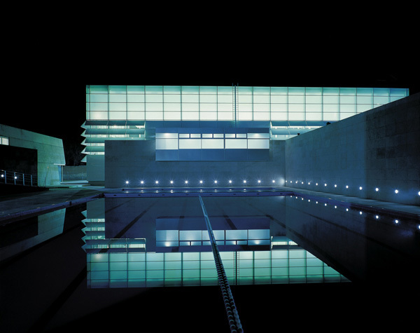 The swimming pool occupies the void of the previously existing cistern, on a pace defined to the south by a glass-block bar-building that contains the dressing rooms, showers, and exercise spaces. This glass box serves also as a night lamp for the school's soccer field, located adjacent to it.