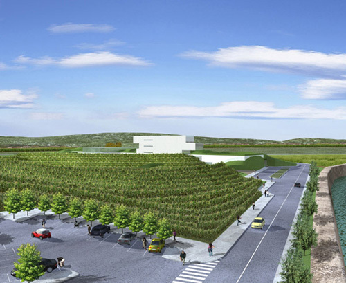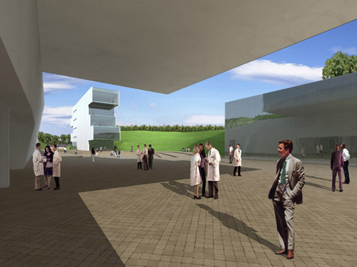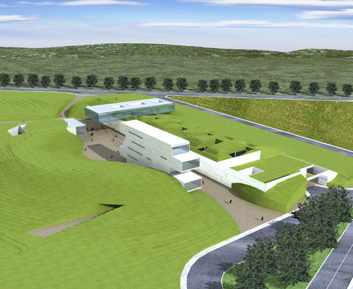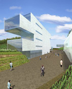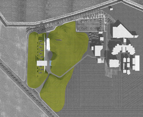 The location and geology of the site-an empty field with a fault line deep below-gave rise to the metaphor that defines the form of the building: an inscribed line divides the program in half, with the laboratories on one side and the administrative and auditorium spaces on the other. This constructed fault line forms an intimate civic space that connects the different programs. The project is nestled into a built-up artificial topography, a new terrain that manifests the nature of the work inside the institution. The laboratories are absorbed into the site, evident predominantly as a series of terraces that modulate transitions between interior and exterior, lab and field.