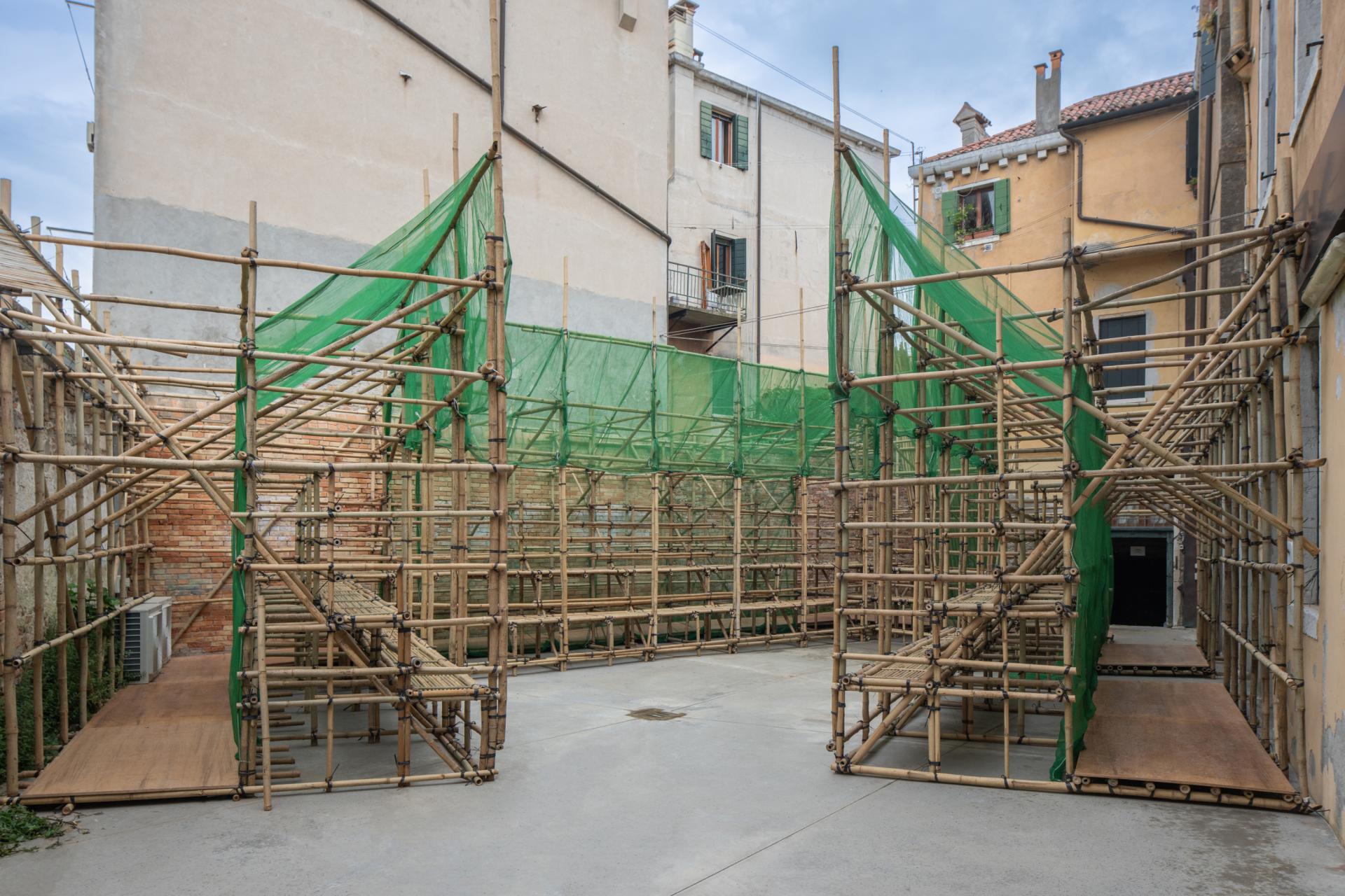 Visitors lining up to see Intelligens: Natural. Artificial. Collective. may notice something curious at Campo della Tana, directly across from the entrance to the Arsenale: bamboo poles poke ever so slightly above the front wall of number 2126, signaling that something of interest lies beyond. There, in the trapezoidal courtyard, sits an amphitheater fashioned from bamboo—a framework for events but also a reference to the scaffolding that has covered construction sites in Hong Kong for centuries but is now at risk of disappearing in favor of metal, per government dictates. The construction lining the edges of the small space foregrounds the idea that, in Projecting Future Heritage: A Hong Kong Archive (May 10 – November 23, 2025), curators Fai Au, Ying Zhou, and Sunnie S. Y. Lau find much to appreciate in things that are overlooked.