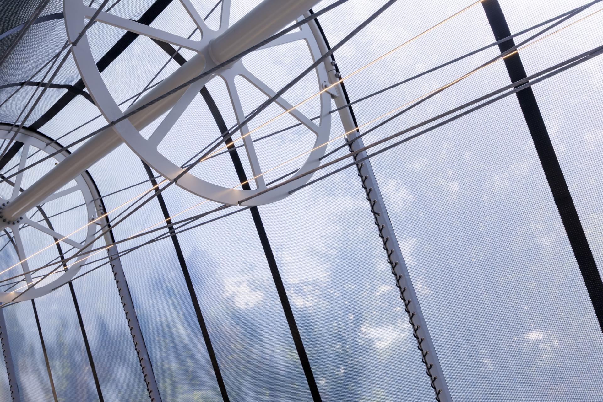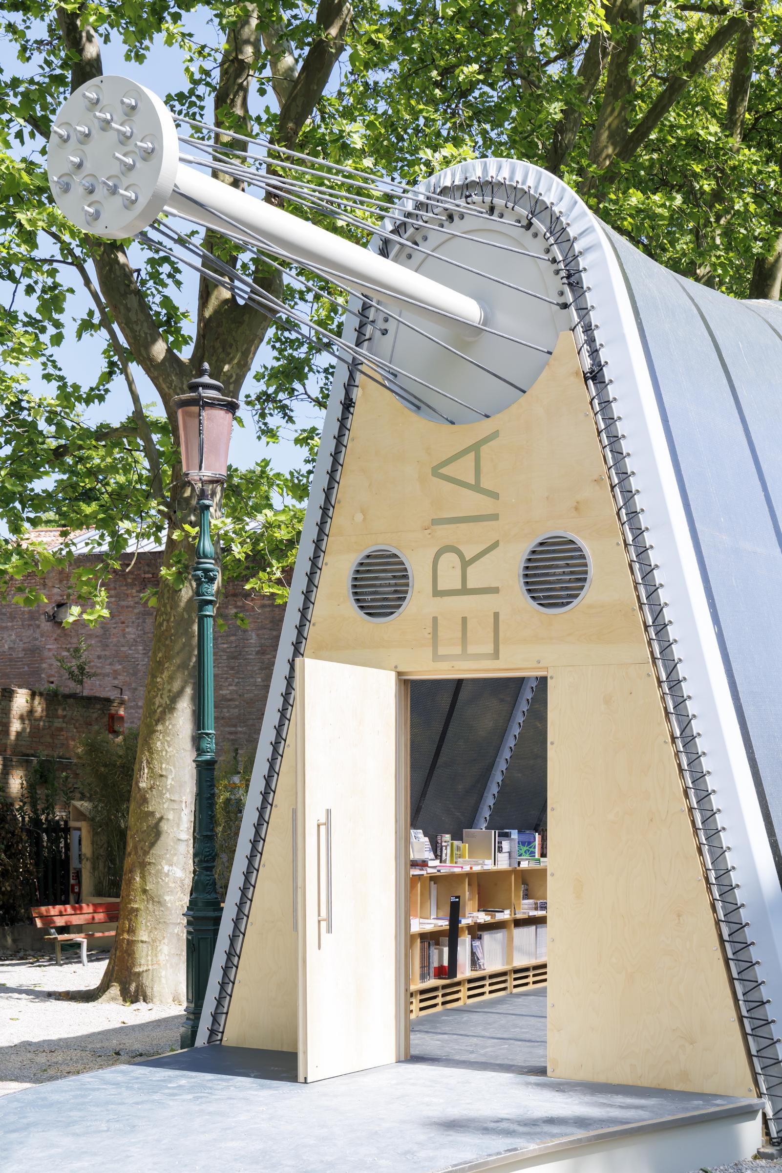 Even before stepping foot inside the bookshop, the structure of La Libreria garners attention: an elongated tensegrity beam projects beyond both ends of the 24-meter-long space. Inspired by Robert le Ricolais's sculptural tensegrity experiments from the mid-twentieth century that aspired to “zero weight and infinite span,” DS+R worked with schlaich bergermann partner to develop the structural system that boldly caps the interior and supports the stretched fiber-reinforced skin. Made from STFE (Structural Transparent Fluorinated Envelope), this skin is reminiscent of the lightweight ETFE foil cushions of DS+R's The Shed near their studio in New York City. During the day, La Libreria captures the feeling of browsing books beneath a canopy of trees, while at night the space glows like a lantern, attracting bibliophiles to it as they depart the Biennale.