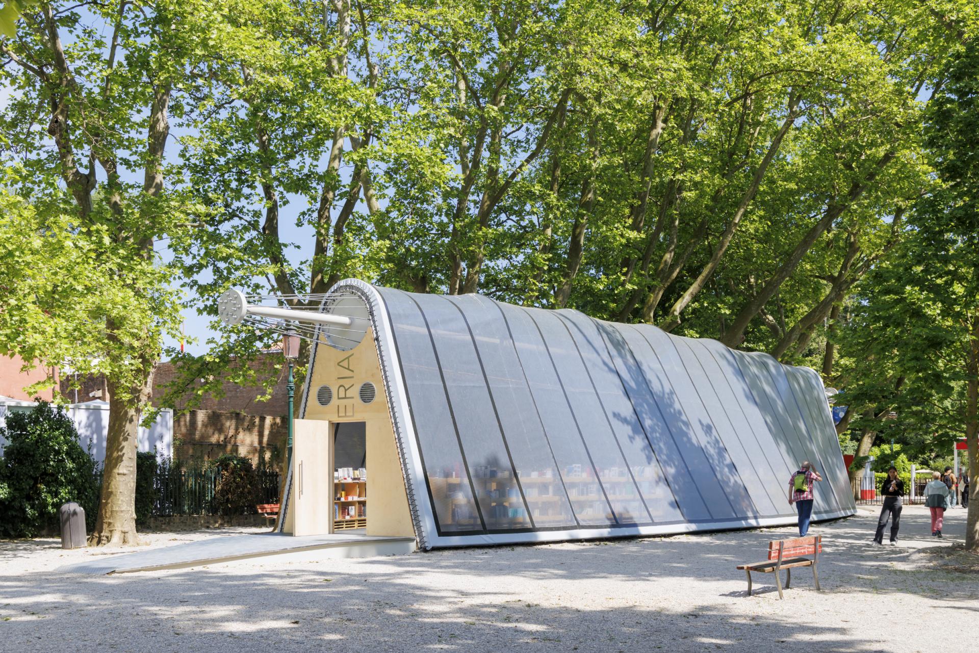 Books are an important part of each Biennale, from the catalogs produced by La Biennale di Venezia to the publications accompanying most if not all of the national pavilions. An expression of this importance can be found at the Bookshop Pavilion in the Giardini designed by James Stirling, Michael Wilford and Associates in 1991, a linear space wrapped by a bold copper awning. Over time, the Bookshop Pavilion became an exhibition space, with books sold in a shop located within the adjacent Central Pavilion. In 2025, with the Central Pavilion closed for renovation and the Bookshop Pavilion once again used for an exhibition, the books have moved to La Libreria, a lightweight, transparent structure designed by Diller Scofidio + Renfro (DS+R) from a concept by Diane von Fürstenberg.