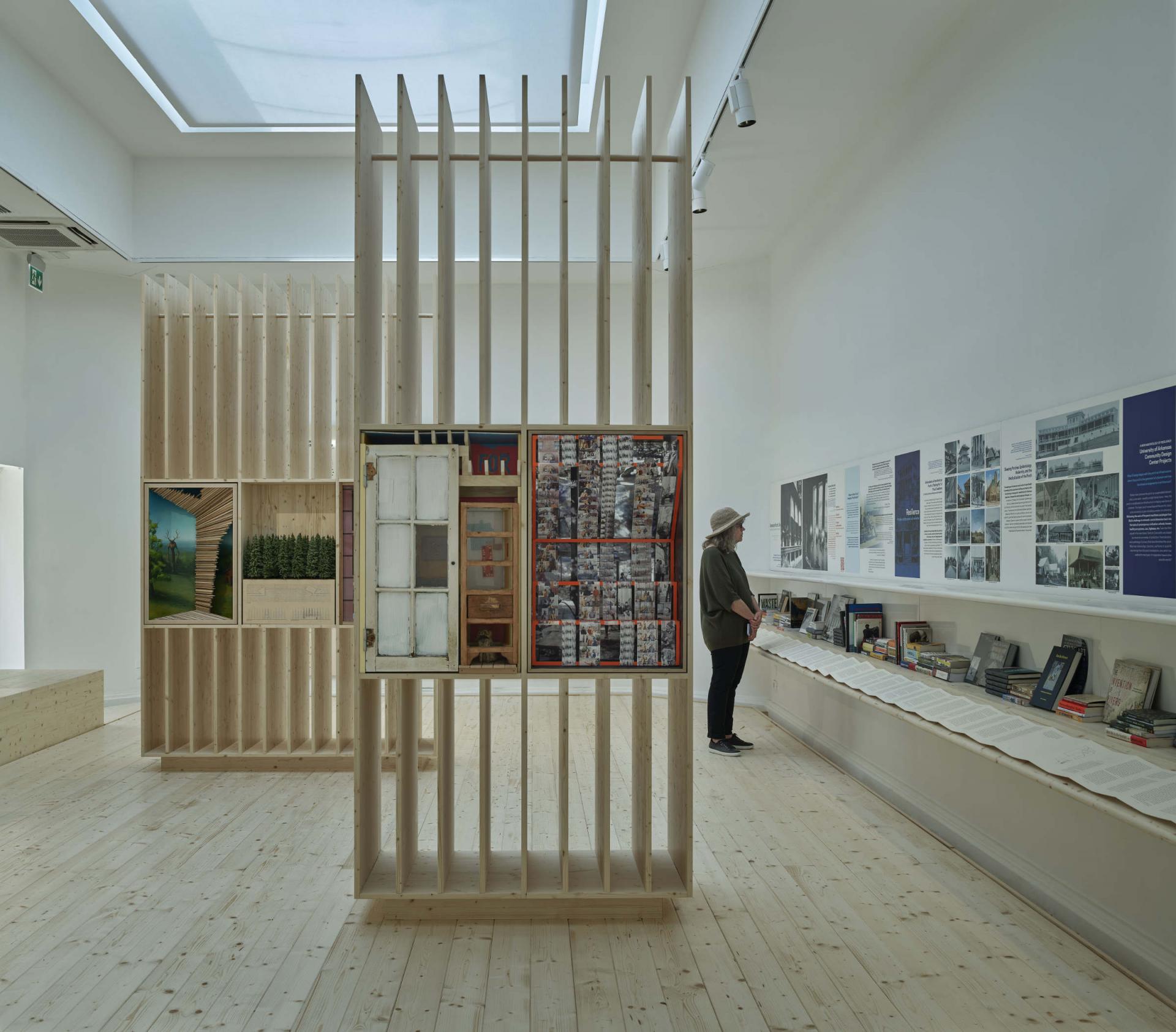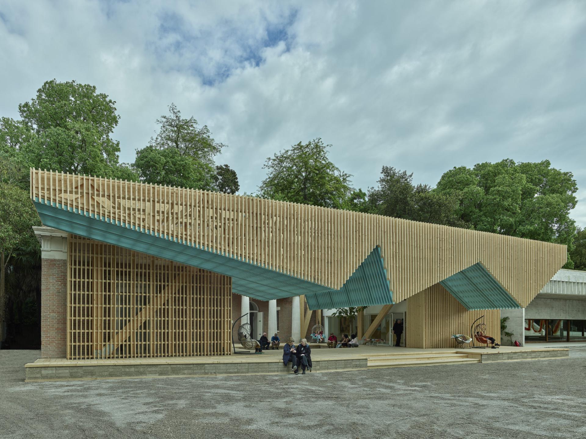 For American Framing, the US Pavilion at the 2021 Venice Architecture Biennale, curators Paul Andersen and Paul Preissner erected a large accessible wooden structure in front of America's stone and brick pavilion in the Giardini. This year, curator Peter MacKieth, from the Fay Jones School of Architecture and Design at the University of Arkansas, and architect Marlon Blackwell have taken a similar approach, cantilevering a slatted canopy on a mass timber structure. The impetus was to create a shaded space—a large porch—for sitting, congregating, and the occasional performance, but the structure also screens views of the neoclassical pavilion that was designed by Williams Adams Delano and Chester Holmes Aldrich in 1930. The structure gives the U-shaped pavilion its own porch and turns its forecourt into a welcoming social space. Furthermore, it elevates vernacular and contemporary approaches to designing covered outdoor spaces over the classical or neoclassical images that may spring to mind when one thinks of the American porch.