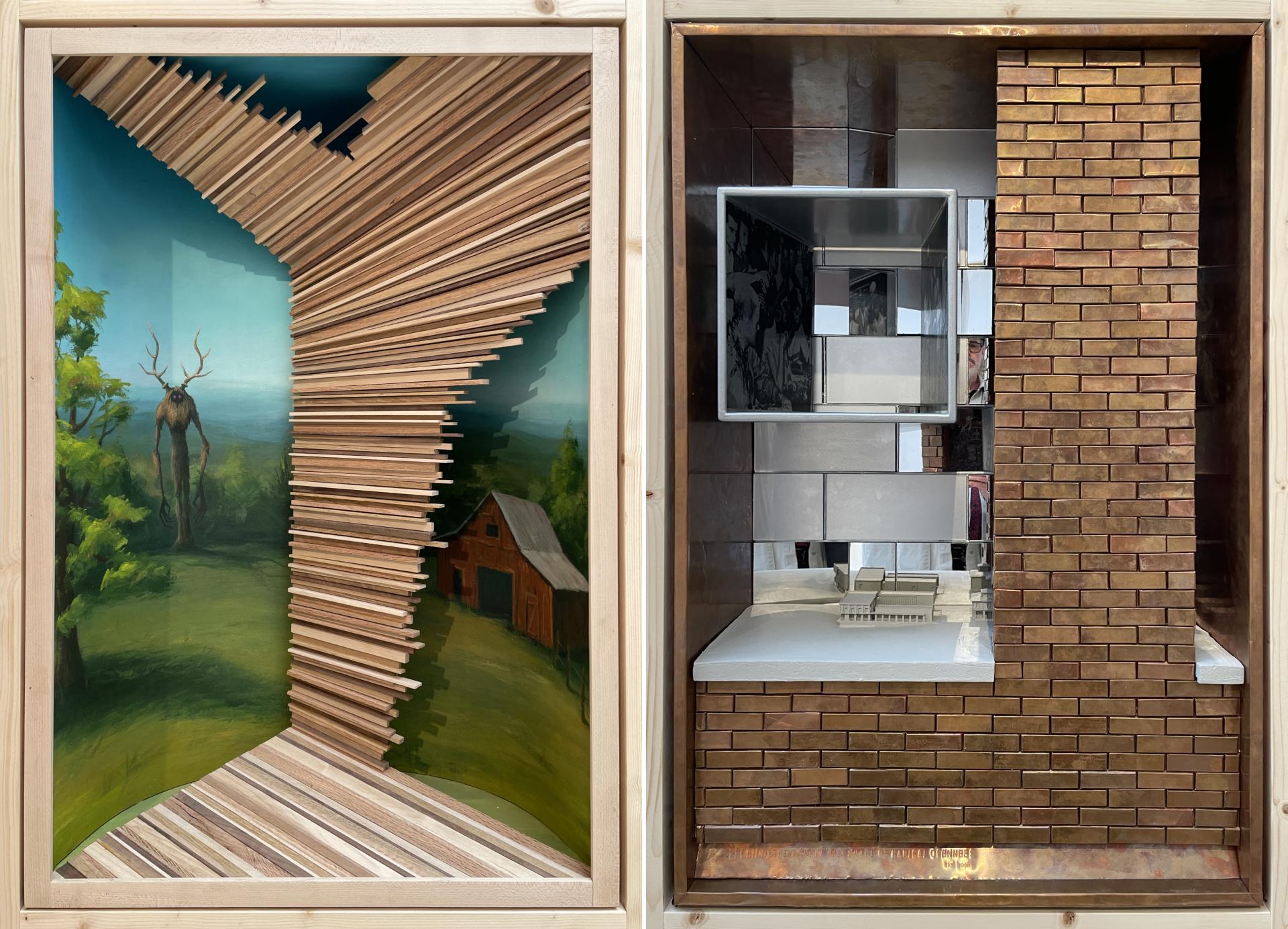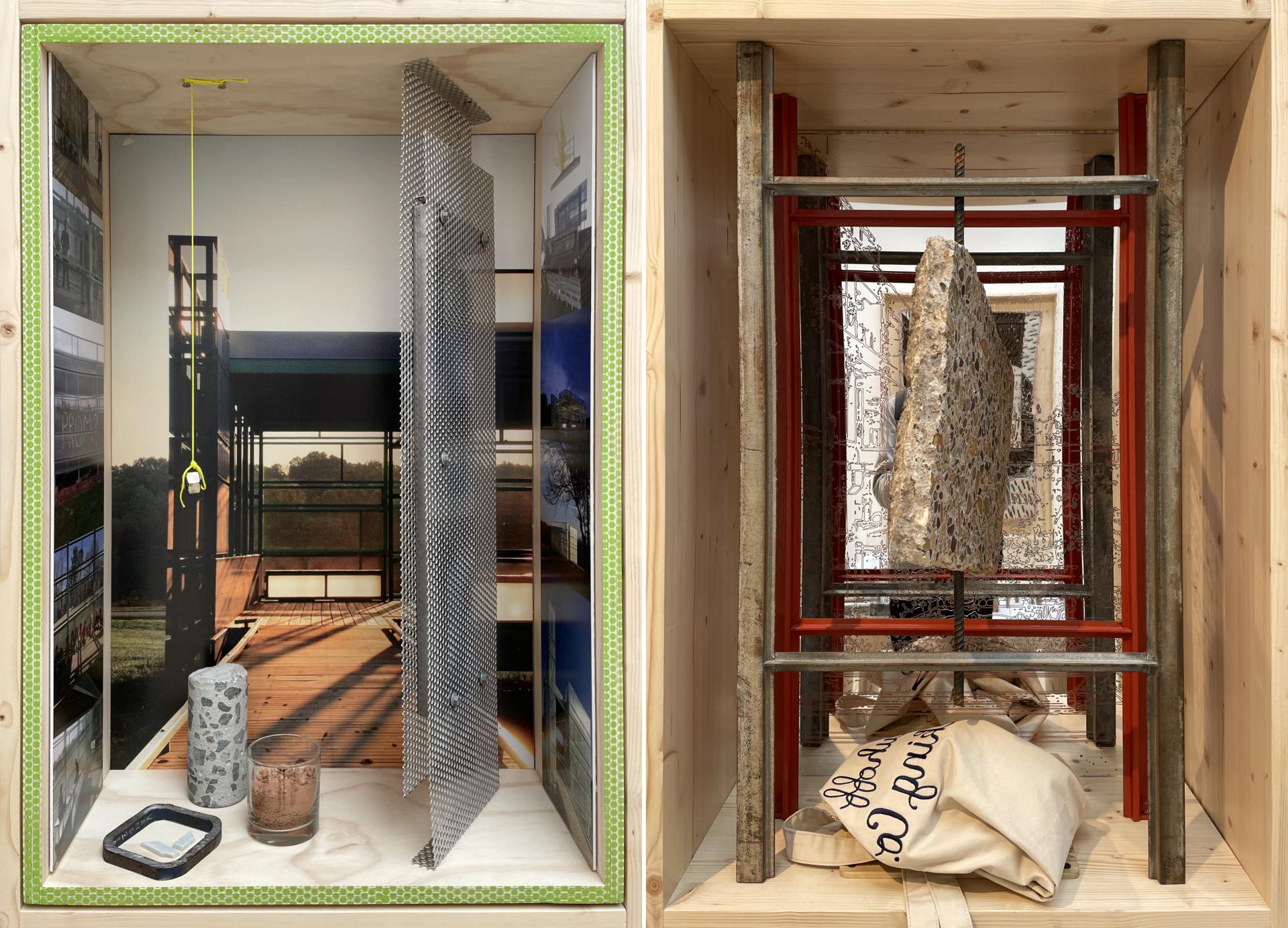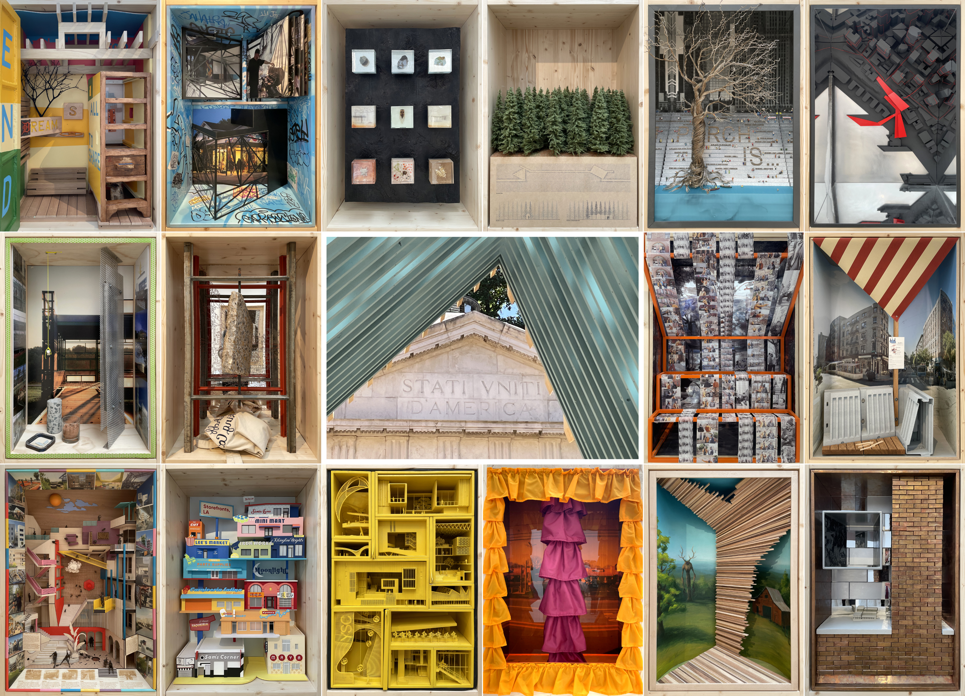 Inside, PORCH: An Architecture of Generosity features 54 contributions solicited from an open call, each one fitted into horizontal and vertical “Porch Windows,” in an exhibition design by Jonathan Boelkins. Together these windows capture the diversity of the United States, demographically and geographically, and of porches themselves, from their sizes and shapes, to their locations and purposes. Some of the displays express the designs of porches or porch-like spaces by architects, while others comment upon the social, environmental, and other roles porches serve today. World-Architects was drawn particularly to the vertical Porch Windows, which are positioned at eye height, are occasionally interactive, and have a depth that makes them spatial, not just flat representations. A few of our favorites are below, grouped into pairs based on shared traits, such as location, form, color, or apparent themes.
