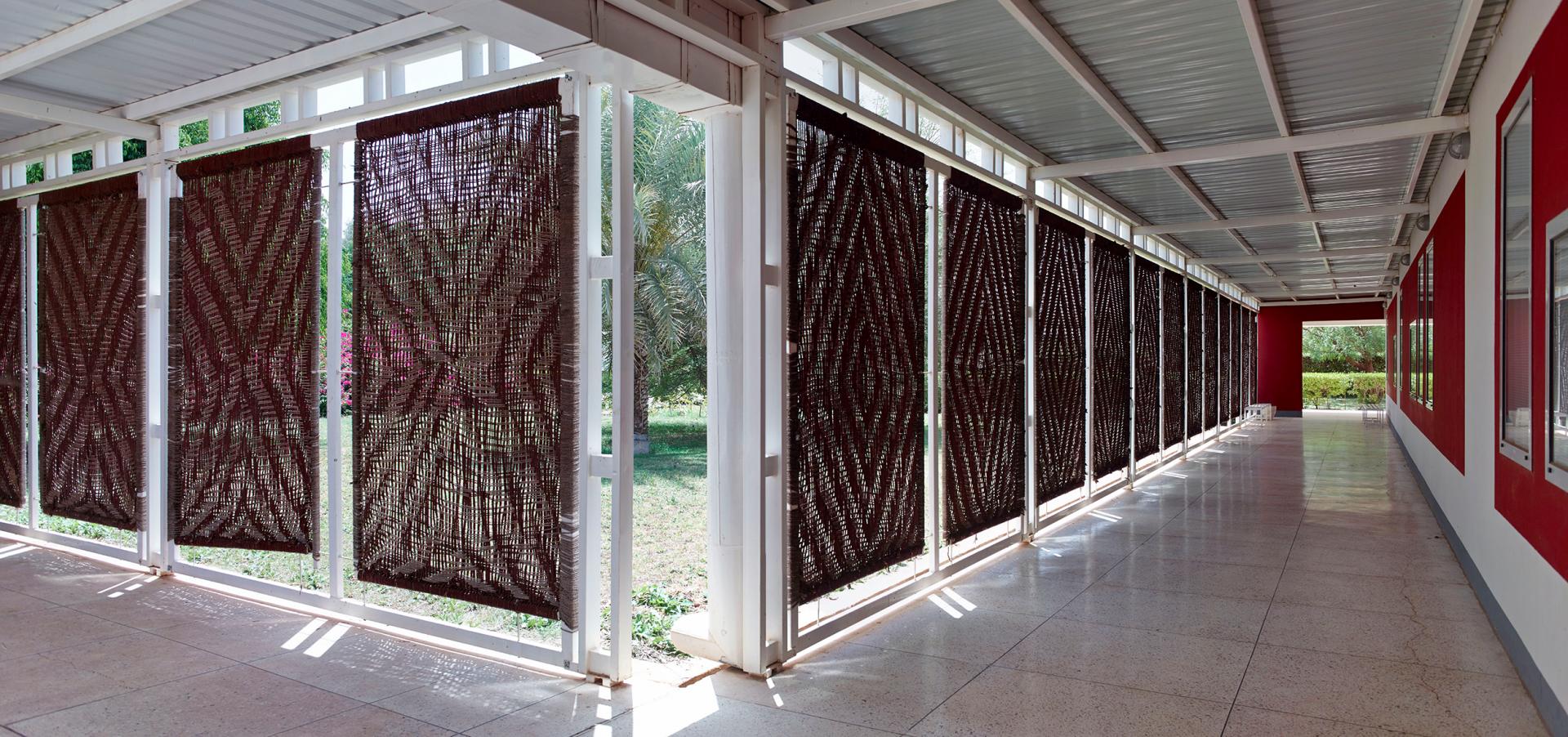 The complex consists of ten modules arranged like houses in a village along a central street, creating a familiar environment. This interpretation of traditional urban structures is complemented by the use of local materials, skills, and ecological strategies. The walls are built from sun-dried clay bricks, whose thermal mass facilitates temperature regulation in the interior. The ventilated double roofs provide protection from the sun by deflecting radiation, and a simple system collects rainwater for irrigating the surrounding trees. The cantilevered roofs shield the clay bricks from rain and direct sunlight. A formative aesthetic element are the colored, protruding wooden window reveals that give the entire complex a cheerful appearance.