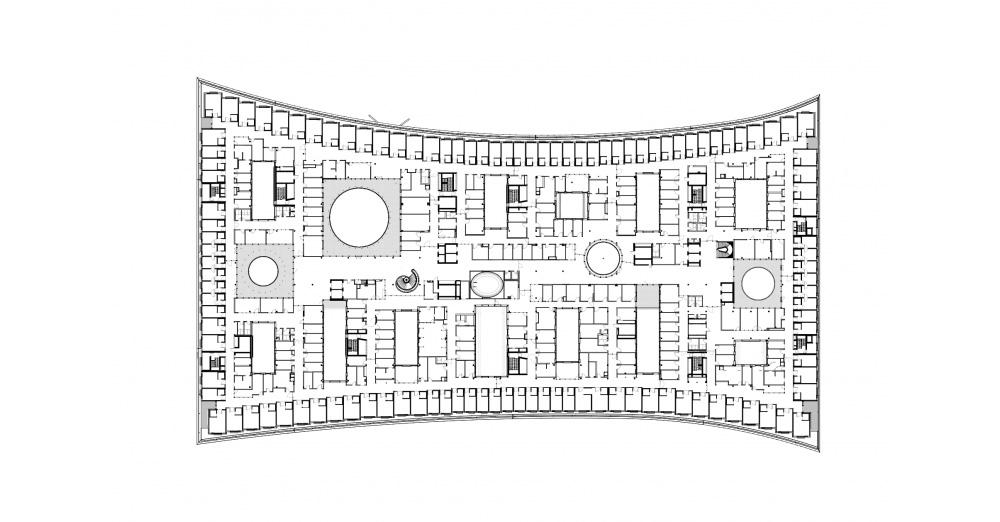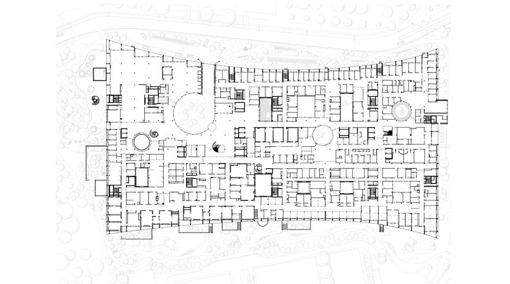 The patient rooms line the building on the top floor. The floor plan also shows the four round courtyards along the patient pathways and twelve additional rectangular atriums, which supply all the offices with daylight. (Plan: © Herzog & de Meuron)