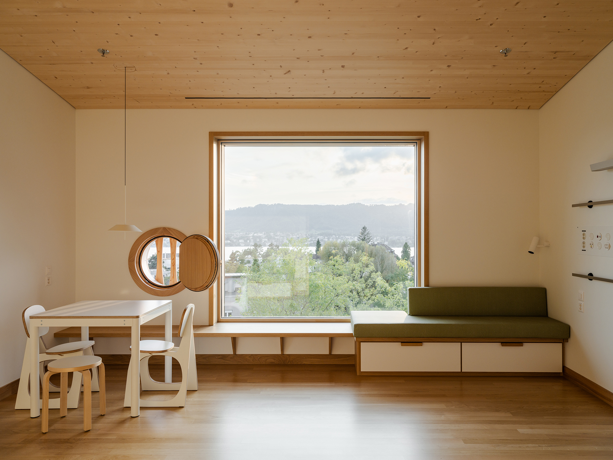 The furnishings have been carefully selected to enhance the well-being of patients: a low and wide bench by the large panoramic window invites children to play or watch the outside world. Given how crucial the presence of parents or other companions is for sick children, additional overnight accommodations have been provided in each room.