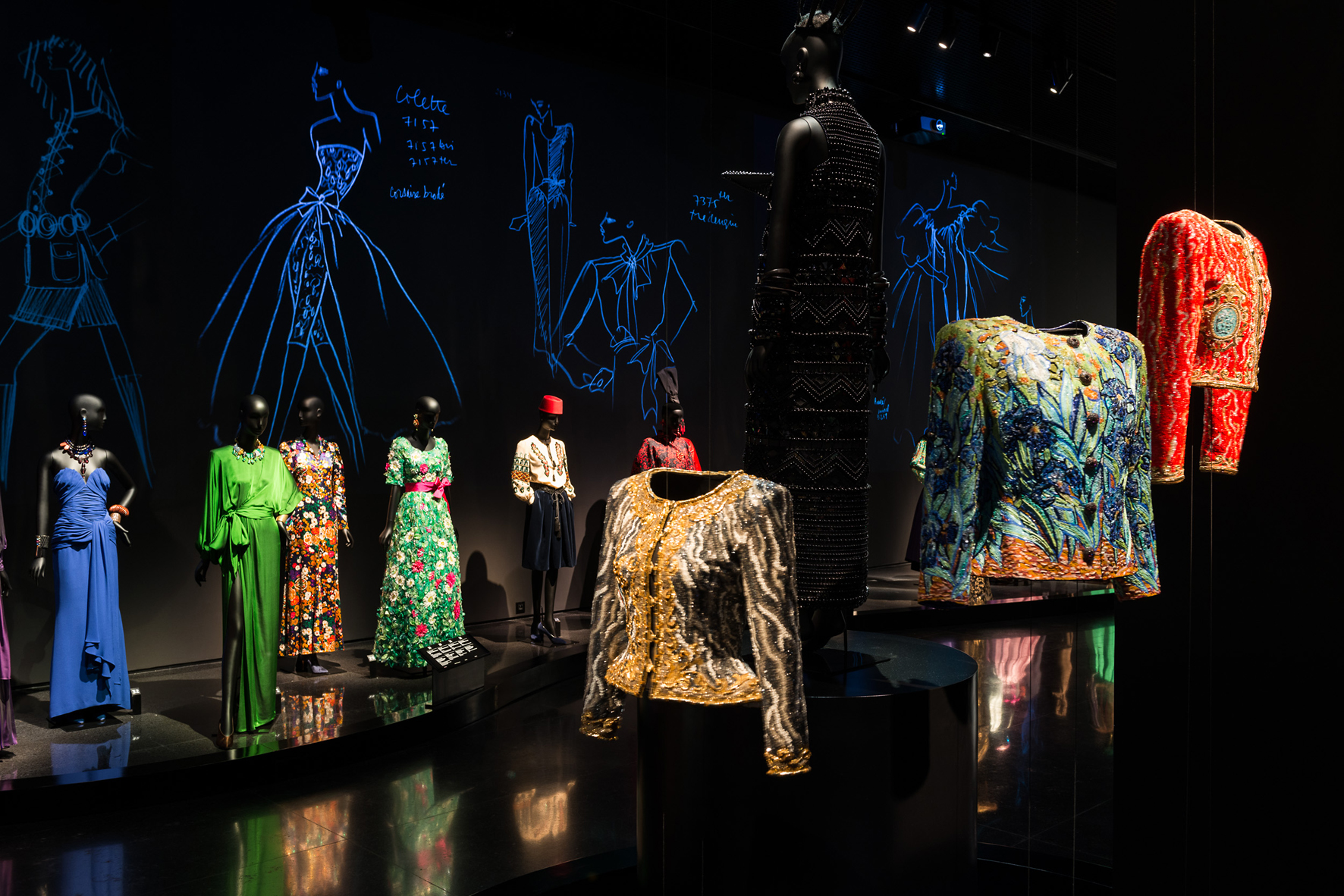 Martin purposefully intended not to present a classic retrospective. He sees the progress through the main exhibition space completely in black as a trip through the mind and spirit of the creative genius. He brings together selected iconographic models taken from four creative decades (1961-2002) along with jewelry and accessories to create an emotional, highly colored, and diverse display. For conservation reasons, different haute couture models from the Fondation Pierre Bergé collection of over 3,000 pieces are displayed at regular intervals. In this way the filigree beauties are not unnecessarily burdened in their exposure to the visitors and public at large. In terms of lighting and also due to conservational considerations, the decision was made for LED technology. Akari-Lisa Ishii, the lighting designer who transformed Martin's scenographic concept into LED lighting tools from ERCO, explains: "LEDs do not generate any heat or UV radiation, which is a very important aspect when illuminating sensitive and valuable textiles."