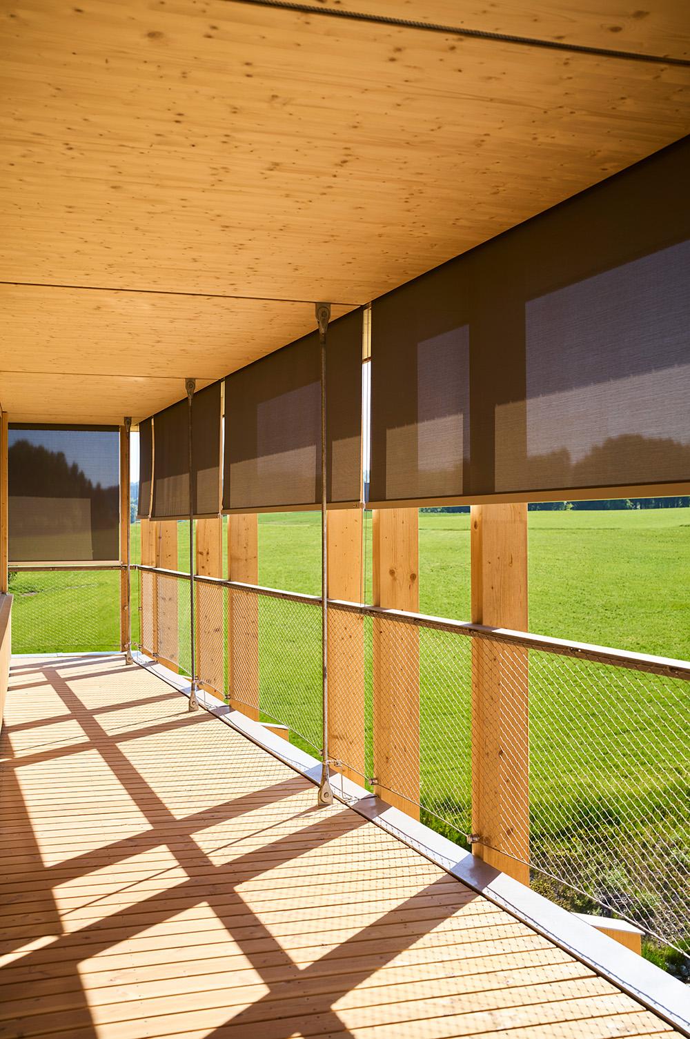 The balconies of the Center for Agriculture in Salez provide shade and protect the upper windows on each floor from receiving direct sunlight. Below them are wooden sliding shutters that occupants can move and position themselves. This keeps the classrooms bright, even when the shutters are closed on hotter days. (Photo: © Seraina Wirz)