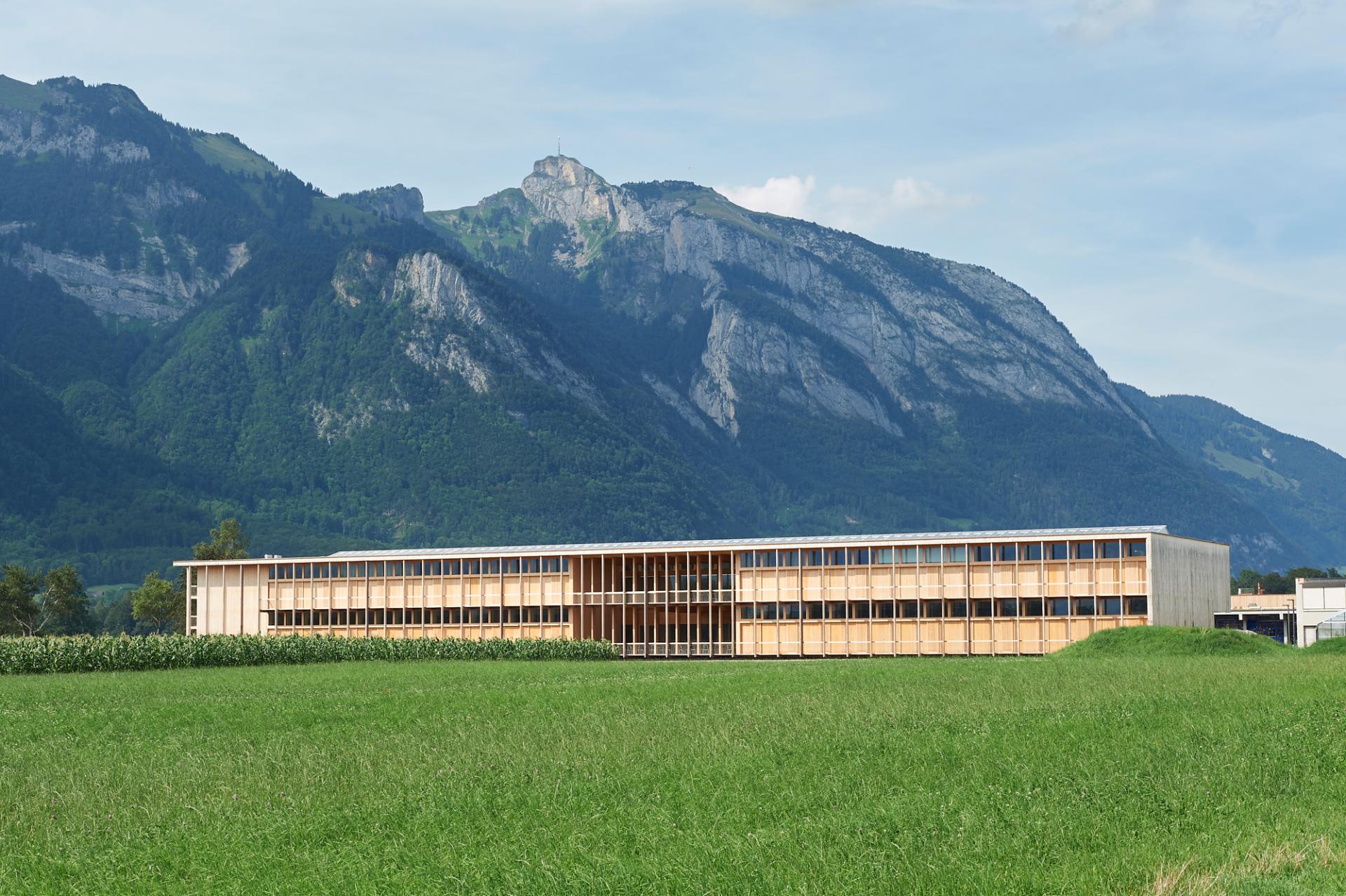 Andy Senn’s Center for Agriculture in Salez in Eastern Switzerland is a pioneering project. The extensive wooden structure has neither air conditioning nor any mechanical ventilation. A pleasant indoor climate is assured solely by its architectural elements such as balconies, sliding shutters and air ducts. (Photo: © Seraina Wirz)