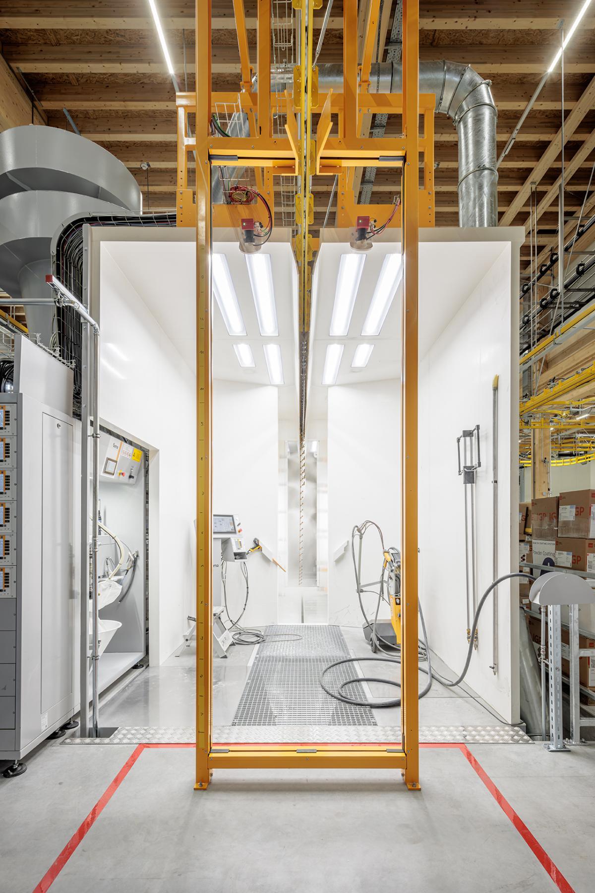 In un primo momento la costruzione di un capannone in legno può sembrare sorprendente. Finora per le costruzioni industriali si ricorreva all’alluminio. Anche Griesser dispone di un capannone produttivo in acciaio accanto all’edificio aziendale appena ampliato. Il legno offre tuttavia una serie di vantaggi: innanzitutto questo materiale naturale accorcia i tempi di costruzione. Le imprese edili del Vorarlberg hanno impiegato meno di un anno per costruire e attrezzare il capannone in legno proveniente dalla regione. Questo ha consentito a Griesser di iniziare la produzione in tempi brevi con un notevole vantaggio economico. La costruzione in legno ha presentato dei vantaggi anche per l’installazione dell’impianto di verniciatura a polvere con il quale vengono rifinite le persiane di alluminio: «Per il nostro fornitore svizzero è stata una novità: ha installato per la prima volta uno dei suoi impianti in un edificio in legno», spiega il Direttore di Griesser Austria Martin Barwart. «Tutto il sistema di sospensione e gli impianti sono stati avvitati direttamente nelle travi. Rispetto alle costruzioni in alluminio sono state molto utili le maggiori tolleranze: durante l’installazione abbiamo potuto effettuare piccoli adeguamenti senza problemi». Anche chi pensa che la protezione antincendio sia un problema in un capannone di legno si sbaglia. «Sono impegnato nei vigili del fuoco», spiega Martin Barwart. «So per esperienza che gli incendi negli edifici in acciaio sono molto più pericolosi. Perché mentre le costruzioni in acciaio cedono all’improvviso e devono essere protette con verniciature costose, i massicci componenti in legno resistono a lungo alle fiamme.»