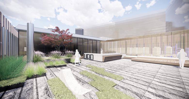 A path leads people to pass through the waterscape and then enter the building. The steel structures make the prefabricated architectural space more flexible, and the overall space is connected by a triple-height lobby. People can communicate on the big steps of the main hall, take a rest in the UAD Cafe, stroll through the side hall to appreciate regularly updated architectural exhibitions, or stand in front of the prefabricated greenery wall and look up to the sky through the photovoltaic glass skylight. Those open public spaces form a fluid circulate route, which helps eliminate the boundaries of different areas.