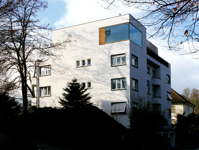 der gewachsenen Fensterordnung und steht so in einem spannungsvollen Dialog mit dem Bestand, ohne sich von ihm abzusetzen. Durch die über Eck angeordneten Erker entstehen zwei Dachterrassen mit unterschiedlichster Aussicht. Die Überhöhung der Erker und die Eckverglasungen heben das Raumgefüge vom Kernbereich ab. Die Bereiche werden zum offenen Raumkontinuum. Dieser Zone entlang angesiedelt ist eine konzentrierte Funktionswand mit Küche, Treppe, Cheminée und Schrankgefüge. Dahinter befindet sich der Privatbereich mit dem offenen Bad und dem Schlafbereich. Über die Zentraltreppe sind das Attikageschoss, die Hälfte des dritten Obergeschoss und die dritte Dachterrasse zur Maisonettewohnung zusammengefasst. Entgegen dem massiven Altbau wurde die Attikaaufstockung aus vorfabrizierten Holz-elementen gefertigt und damit kurze Bauzeiten und geringe Auflasten herbeigeführt.