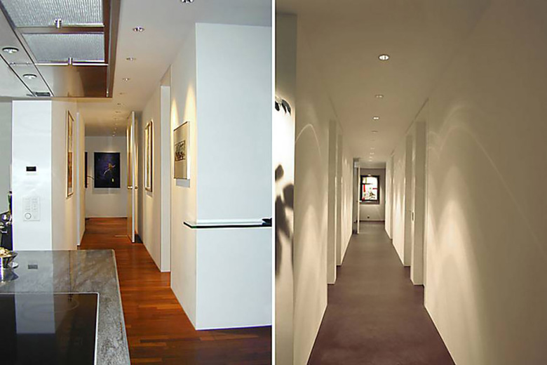 Es ergibt sich eine spannungsvolle räumliche Differenzierung. Die Aussenwände sind entmaterialisiert, sprich verglast. Dadurch verstärkt sich der Eindruck der schwebenden Geschossplatten erheblich. Die lichtdurchfluteten Innenräume und die Terrasse mit Panoramasicht verschmelzen zu einer Einheit. Die Wohnanlage strahlt ein mediterranes Ambiente aus. Die eingeschossigen Wohnungen haben immer den gleichen Aufbau mit einer klaren Raumabfolge. Wohn-, Essbereich und Küche bilden einen einzigen loftartigen Raum, der sich über die Glasfronten zum Tal und Innenhof hin öffnet. Dieser Raum setzt sich über den Korridor fort und mündet in das Haupt-Schlafzimmer. Es entsteht ein ununterbrochenes Raumkontinuum, in dem die Räume ineinander fliessen.