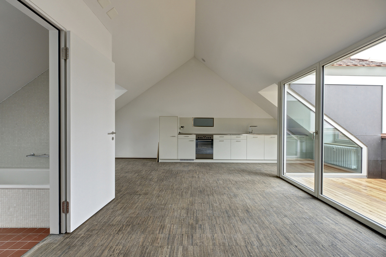 Anders im Dachgeschoss: hier unterstützen offene Grundrisse, überhohe Räume und eine entsprechende Materialisierung die Grosszügigkeit der bestehenden Dachräume. Im überhohen Mittelhaus ist die Dachwohnung gar als Maisonette-Wohnung ausgebildet.