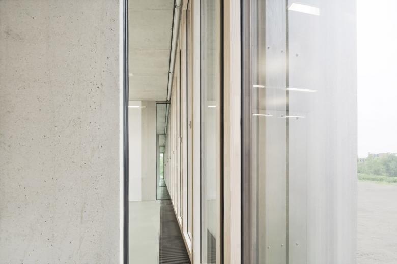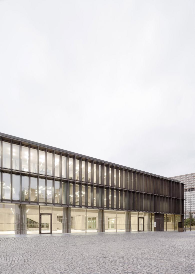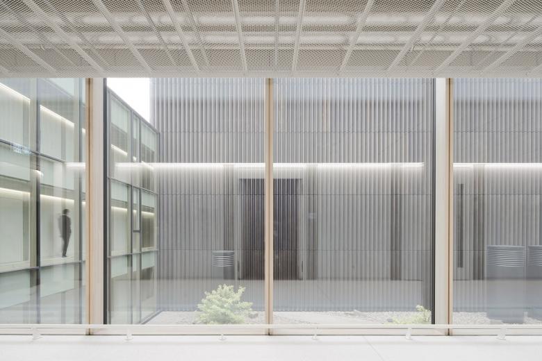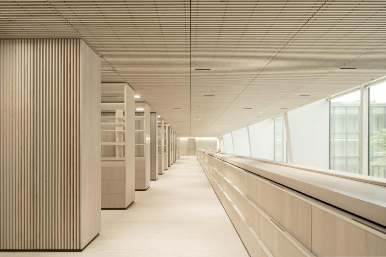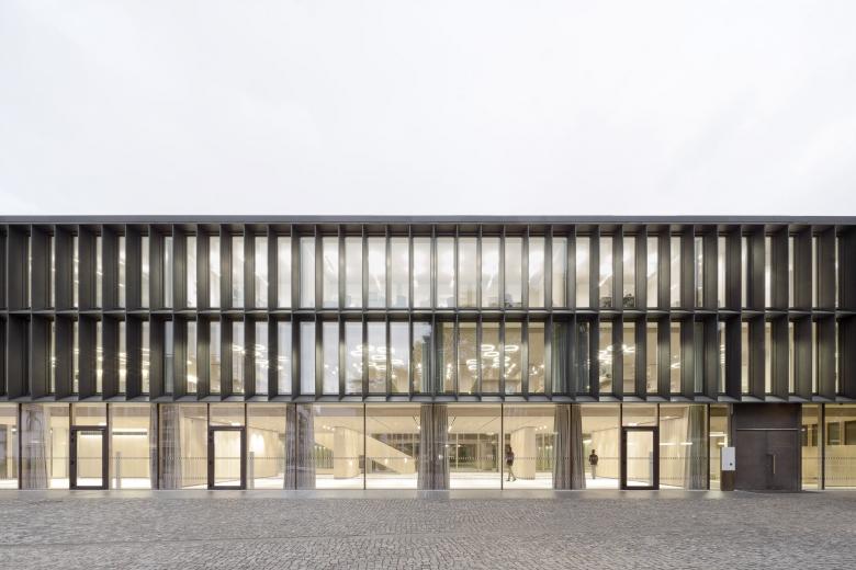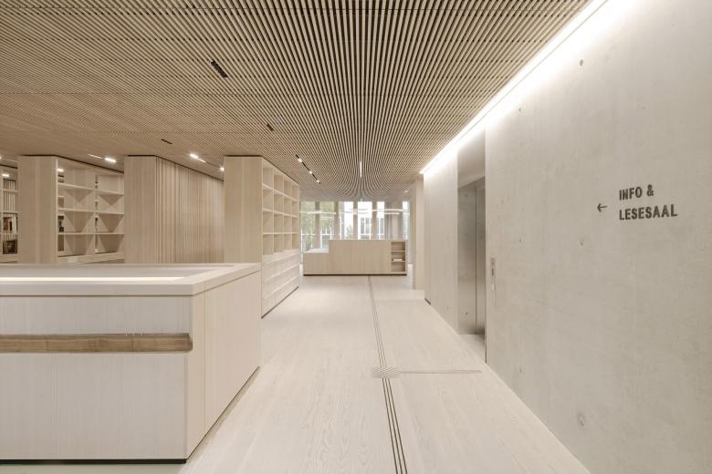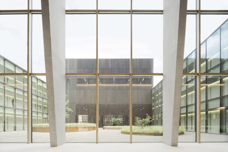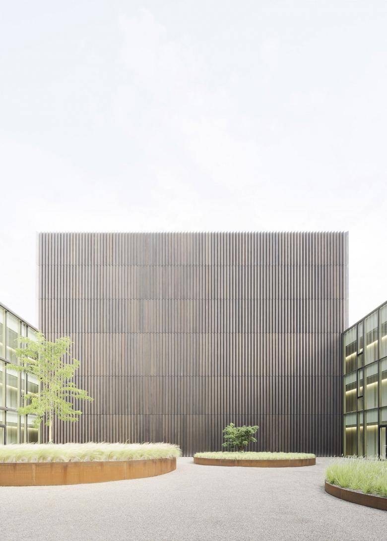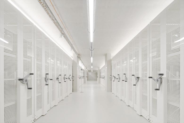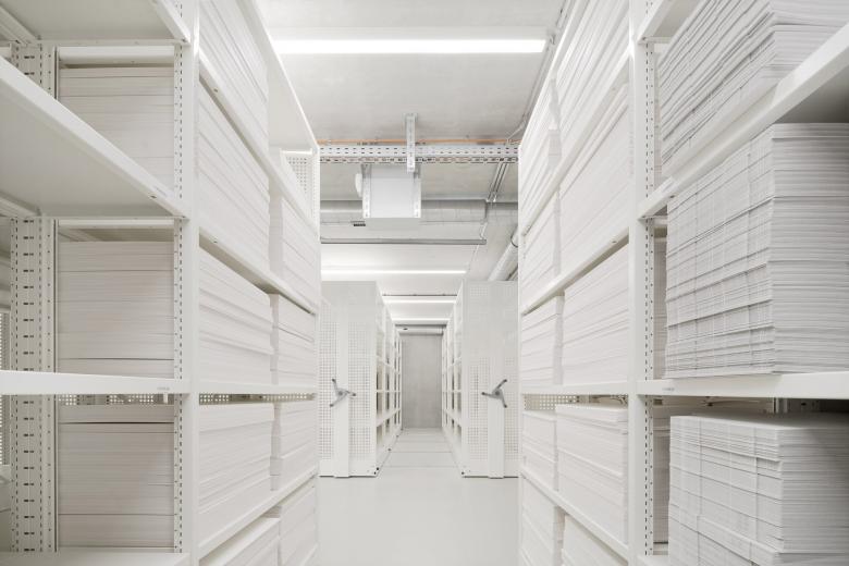 Eine dreigeschossige Mantelbebauung umfasst schützend die Archivalien – aus dem langgestreckten Schutzbau mit seiner ruhigen, zeitlos unaufgeregten Architektursprache, erhebt sich der fensterlose, auratische ‚Schrein‘ wie ein Schatzhaus.