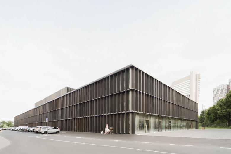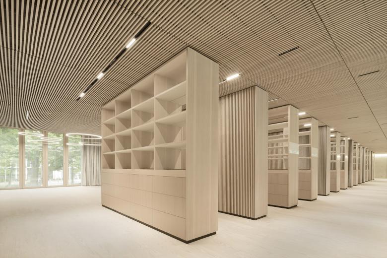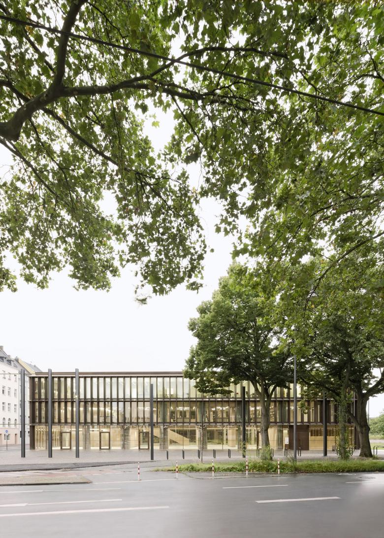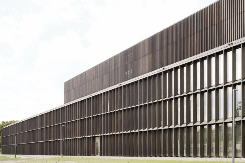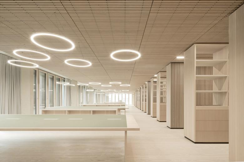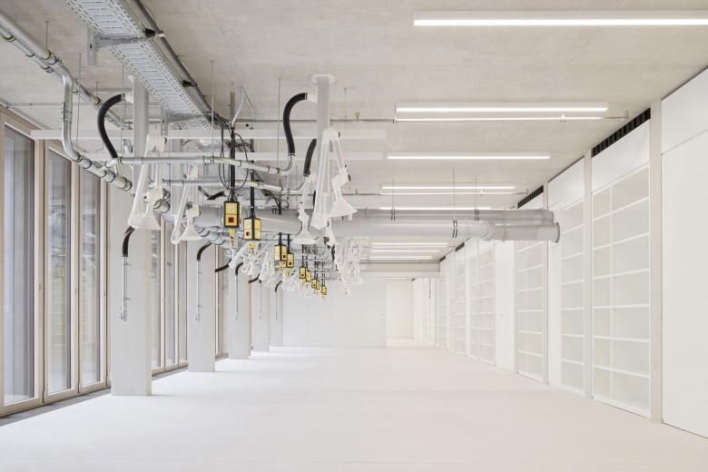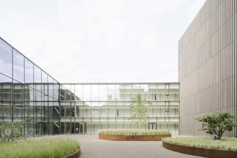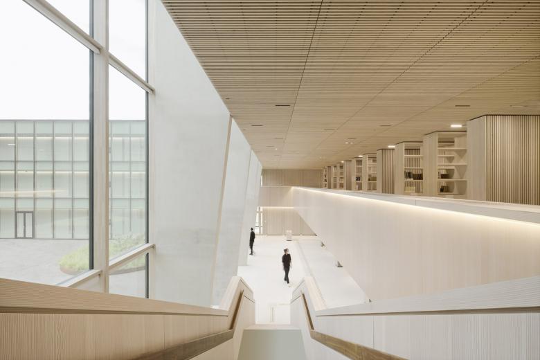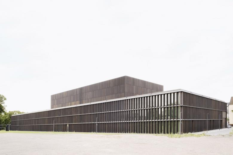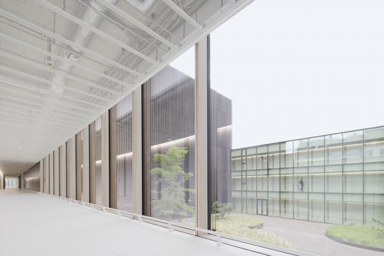 Eine dreigeschossige Mantelbebauung umfasst schützend die Archivalien – aus dem langgestreckten Schutzbau mit seiner ruhigen, zeitlos unaufgeregten Architektursprache, erhebt sich der fensterlose, auratische ‚Schrein‘ wie ein Schatzhaus.