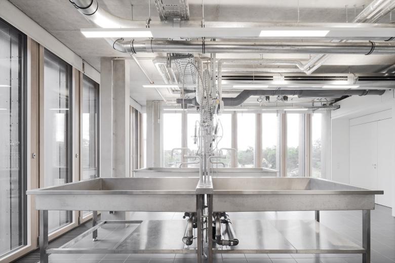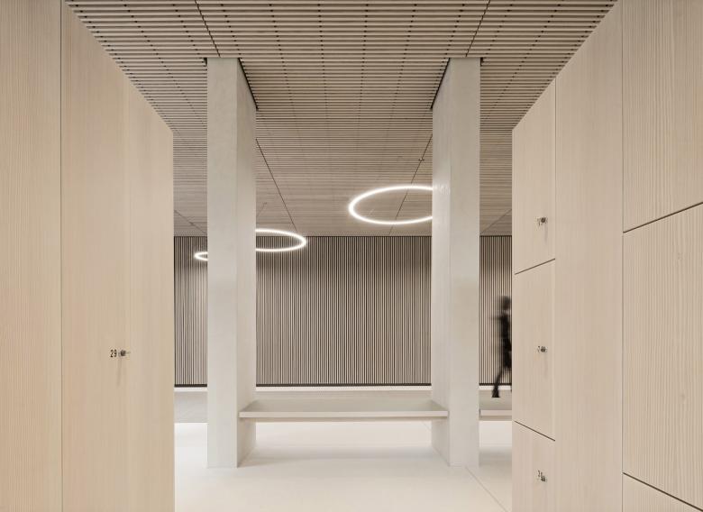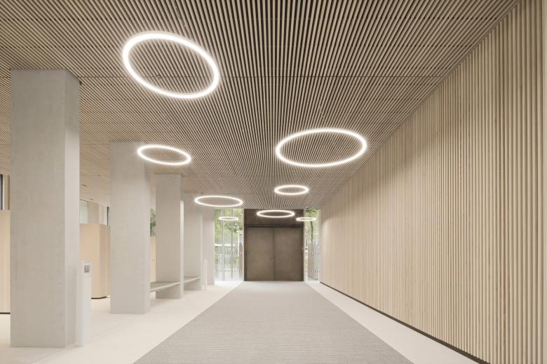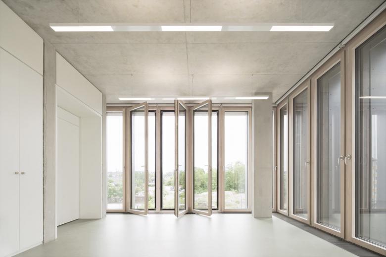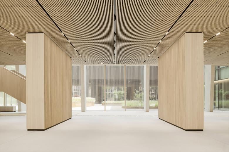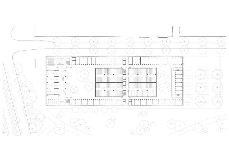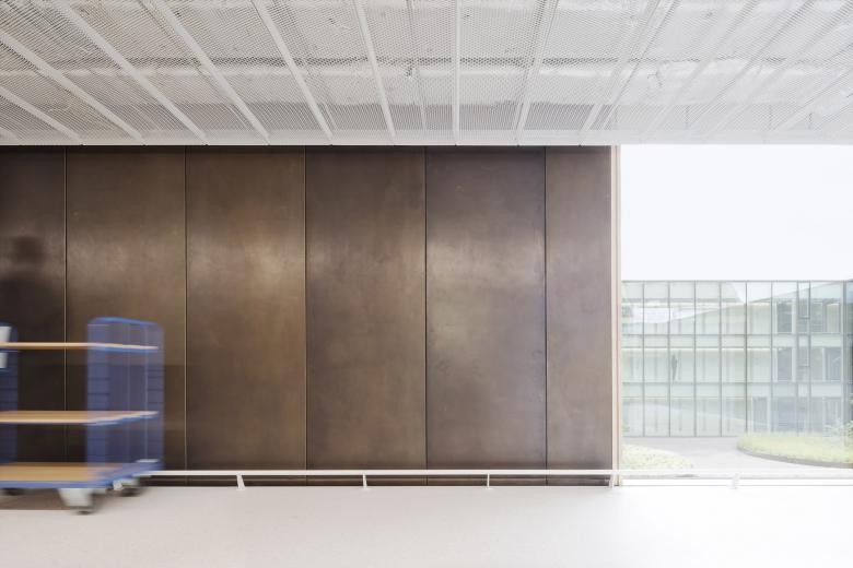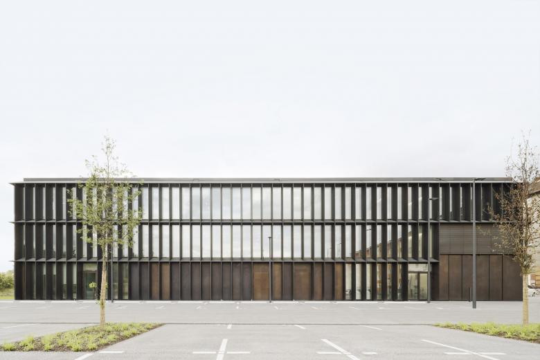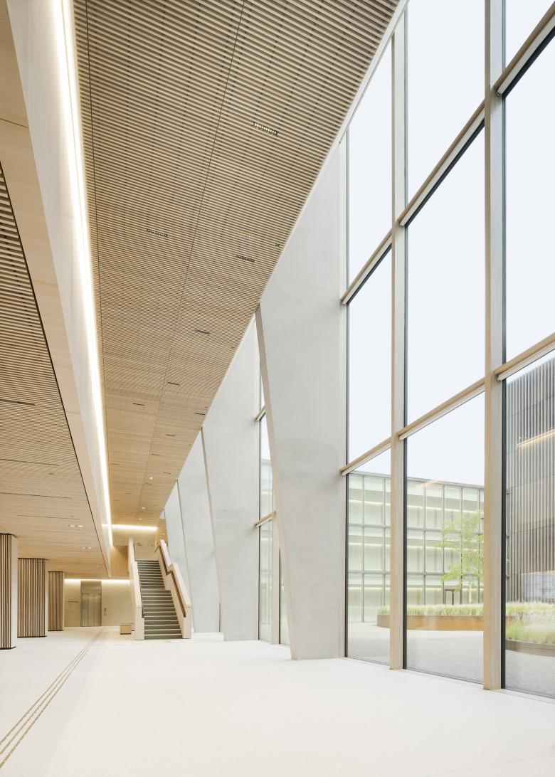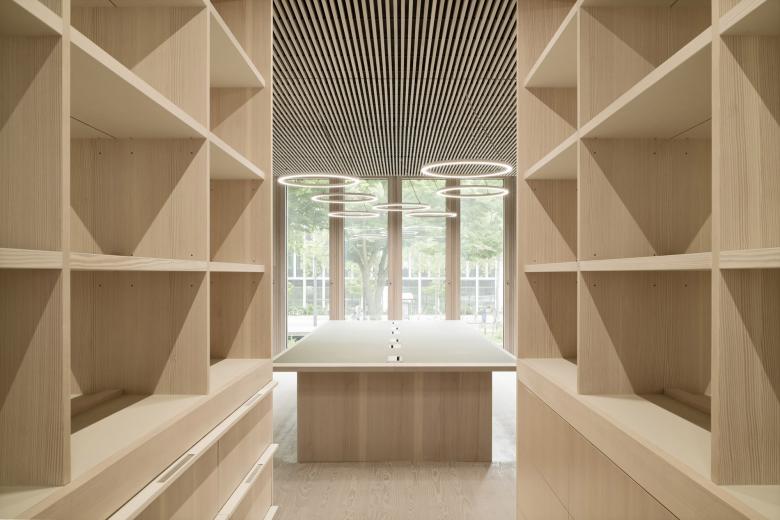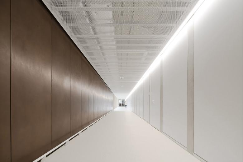 Eine dreigeschossige Mantelbebauung umfasst schützend die Archivalien – aus dem langgestreckten Schutzbau mit seiner ruhigen, zeitlos unaufgeregten Architektursprache, erhebt sich der fensterlose, auratische ‚Schrein‘ wie ein Schatzhaus.