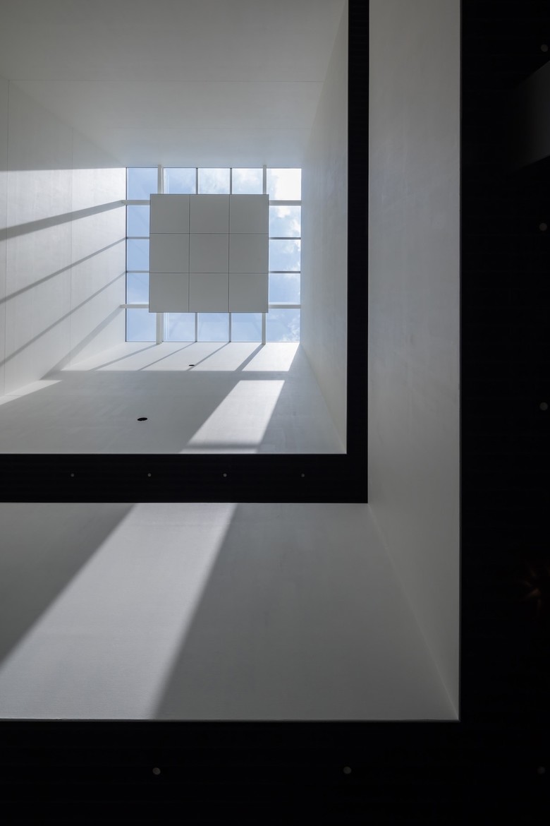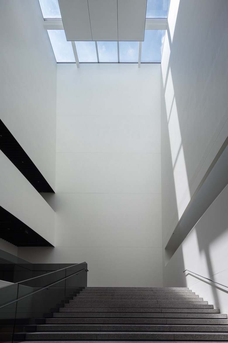 天井高が約25mあり、スカイライト越しの空だけが見える2階のアトリウムは、天井高も低く抑えた1階のエントランスホールとは対照的に、自然光の溢れる明るい空間であり、刻々と変わる太陽の位置によって光は日時計のように動く。