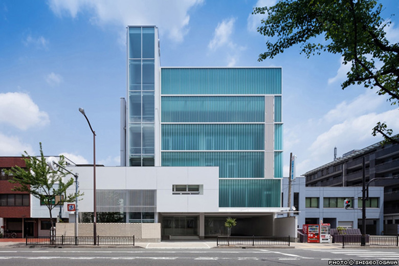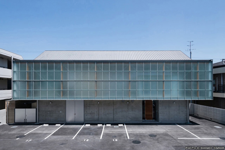 南側は大都市郊外の交通量の多い主要幹線道路に面し、24時間自動車が溢れている典型的な大都市郊外の風景、それに反して北側は静かな住宅地域を抜ける細い道路に面してごく日常の生活空間が広がっており、まるで様相が異なっている。そうした敷地状況から、建物を2棟に分けてその中間を駐車場とすることで、まず郊外に建つ建築に機能的に要求される駐車台数を確保した。