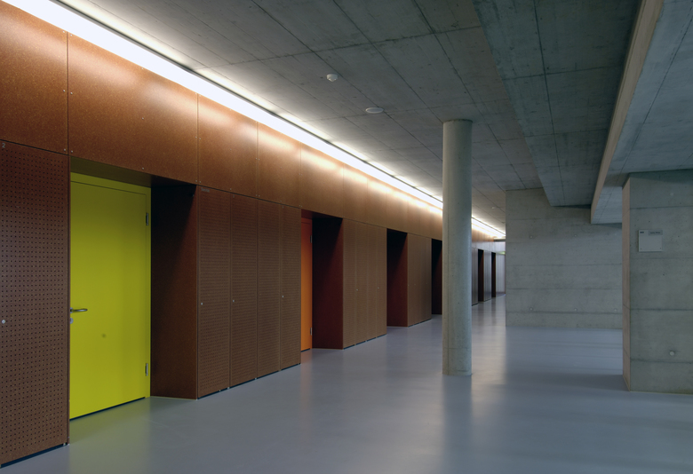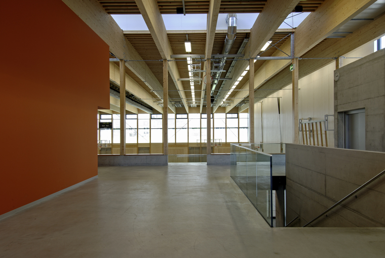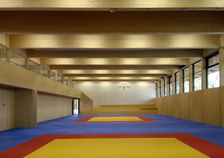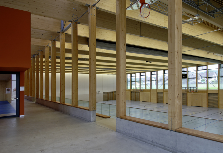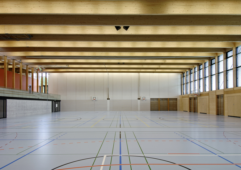 Im Laufe der Bearbeitung wurde die Holzkonstruktion durch Verdoppelung der Binderabstände optimiert. Durch die Ausbildung der Dachbinder als Durchlaufträger konnte im Erdgeschoss mit geringen Mehrkosten eine Kampfsporthalle mit dreiseitiger Zuschauergalerie integriert werden. Die Garderoben und Duschen sind im Untergeschoss angeordnet.