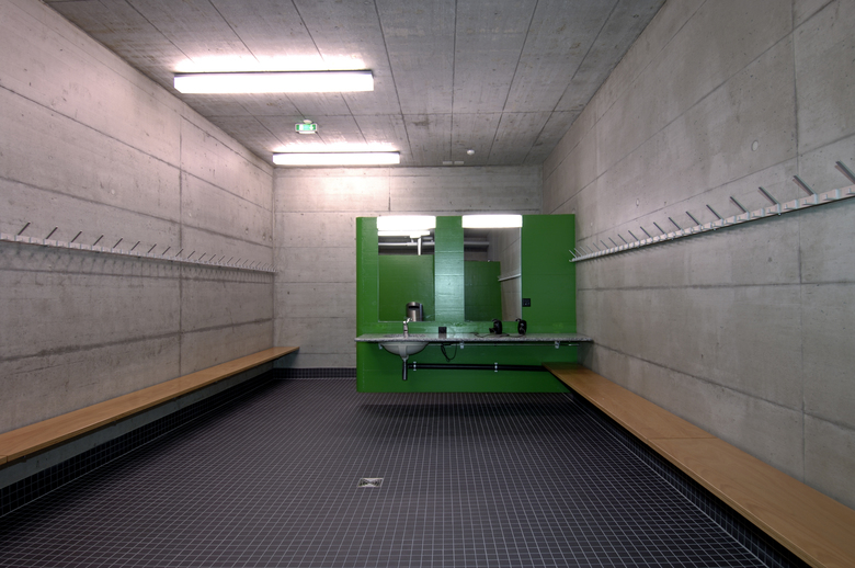 Um das Volumen der Sporthalle im Massstab der Umgebung anzupassen, wurde das Hauptgeschoss um ca. 3 Meter eingegraben. Dies führte dazu, dass vom Haupteingang im Erdgeschoss eine gute Übersicht auf das Spielfeld besteht und die Zuschauergalerie direkt erschlossen werden kann.