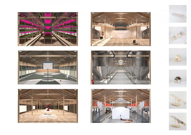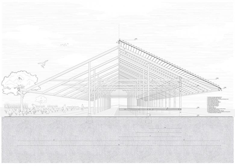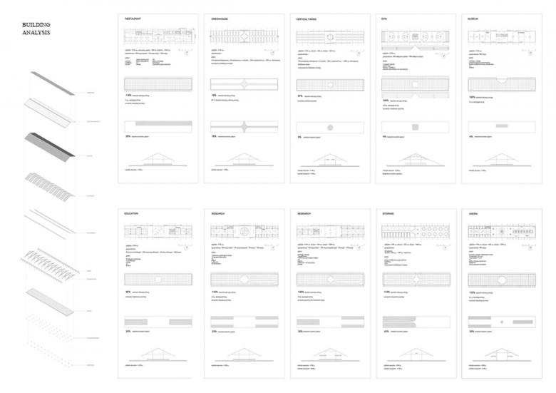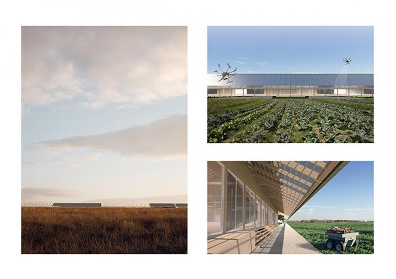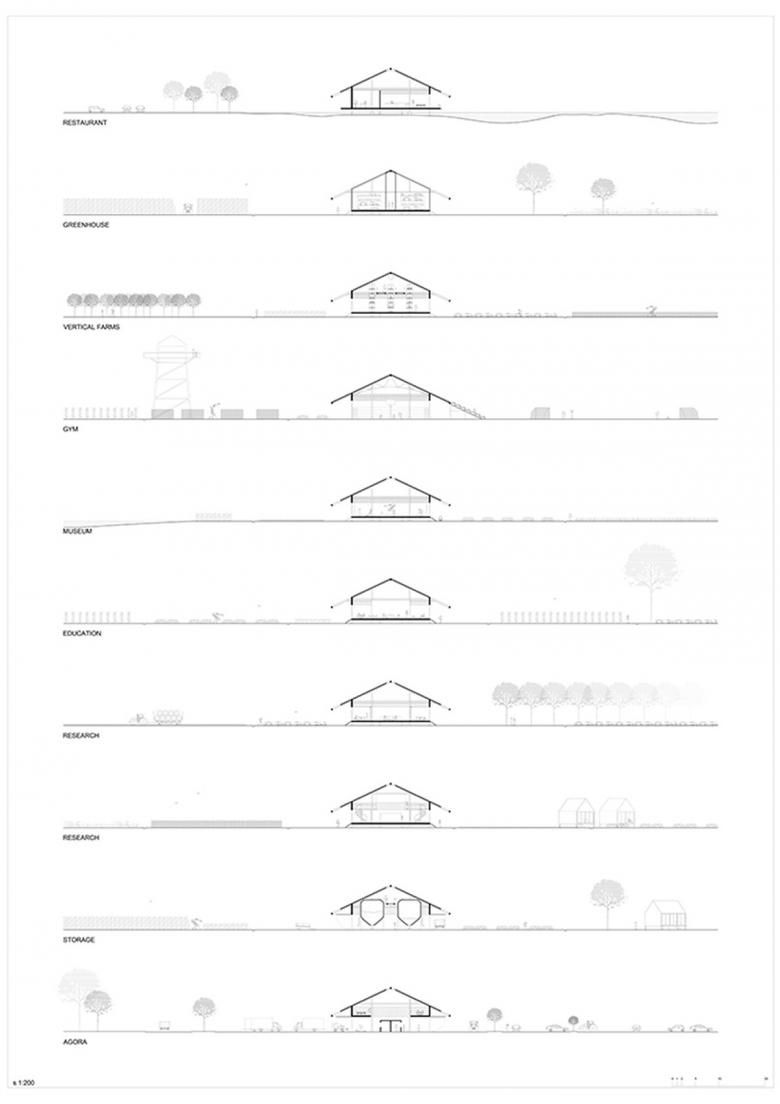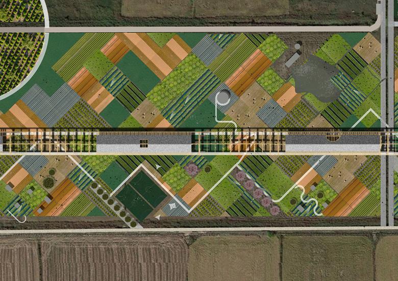 The proposal transforms 50 hectares of agricultural land into an alternative agricultural typology, consisting of a sequence of spaces, offering cultural and community facilities developed around farming and food production. Thus, it makes this new structure an active economic and social center, forming a new model of the relationship between consumer and producer. The resulting program variety reflects the entire food chain, from research, education, cultivation, and harvesting, to storage, sale, and consumption. Architecturally, the proposal is based on the typology of the elongated pitched roof. This type is chosen as it is found in the countryside at all scales, from huts and paddocks to large warehouses and industrial facilities. At the same time, it is an architectural typology easily adaptable to any use. Moreover, the wooden pitched roof is an archetype that, together with its ecological character, embodies the social footprint of the proposal. Also, the choice of this type allows for easy future expansion of the structure or even its transfer to a new plot, leaving the minimum possible footprint on the environment. The roof is placed within the existing fields along the main highways. In this way, a network of infrastructure can be created to connect the diffuse villages of the plain. New experimental crops are being created around the roof which adopts the pixel cropping model. Under the roof frame the new uses are developed linearly, all integrated into the typology of a 17 x 100m building, adopting the scale of the other facilities in the area. The proposed new uses are divided into three categories: the research buildings, the buildings for new farming methods and the public buildings. The various successive layers construct a new landscape, both rural and urban, quite simple and complex at the same time, which makes its presence in the place but also blends into it, adopting its morphological vocabulary and the materials one finds in it, attempting to redefine the Greek countryside.