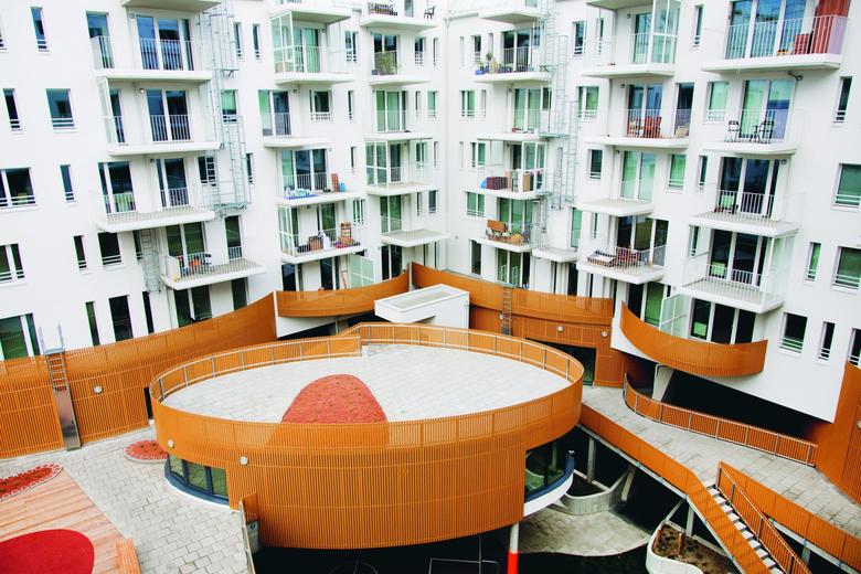 Ausgehend von der urbanen Umgebung des Bauplatzes, wurde das Passivhausprojekt als U-förmige Blockrandbebauung ausgeführt, die einen zentralen Innenhof umschließt und somit eine Neuinterpretation des „Wiener Blocks“ darstellt. Besonderes Augenmerk wurde in der Planung auf die Freiraumqualität und der damit verbundenen hohen Wohnqualität gelegt. Die unteren Ebenen des Gebäudes sind terrassenartig zoniert. Gemeinschaftseinrichtungen, Grünflächen, Spielplätze und Parkraum bilden ein räumliches Geflecht, das durch sensible Materialisierung erleb- und bespielbar wird. Herkömmliche Bebauungsstrukturen werden von innovativen Mustern abgelöst. Großzügig dimensionierte Erschließungs- und Gemeinschaftsräume verstärken nachbarschaftliche Beziehungen. An den Ecken des Gebäudes ist einerseits ein sozialer Stützpunkt in Form einer Hausbetreuung, auf der anderen – nahe der Schule – ein Geschäftslokal, situiert.