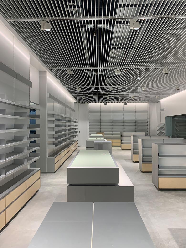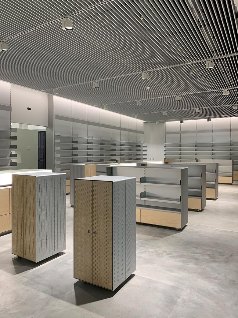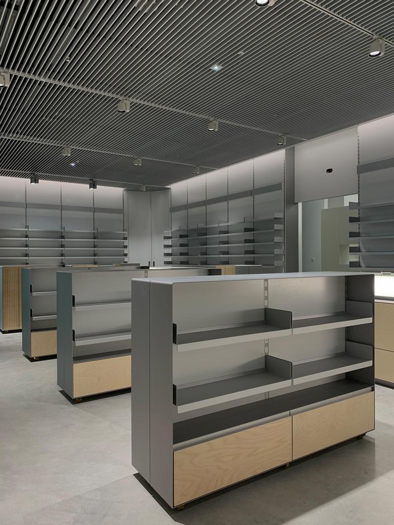 Im Zuge des Umbaus des Hertizentrums konnten wir den Einbau einer Apotheke planen. Neben hohen Anforderungen an eine optimale räumliche Logistik haben uns die Art und Weise der Präsentation der bis zu zweitausend Artikel im Ladenteil der Apotheke interessiert. Die konstruktive Entwicklung eines flexiblen und platzsparenden Regalsystem hat den architektonischen Ausdruck der Apotheke schlussendlich massgebend beeinflusst.
