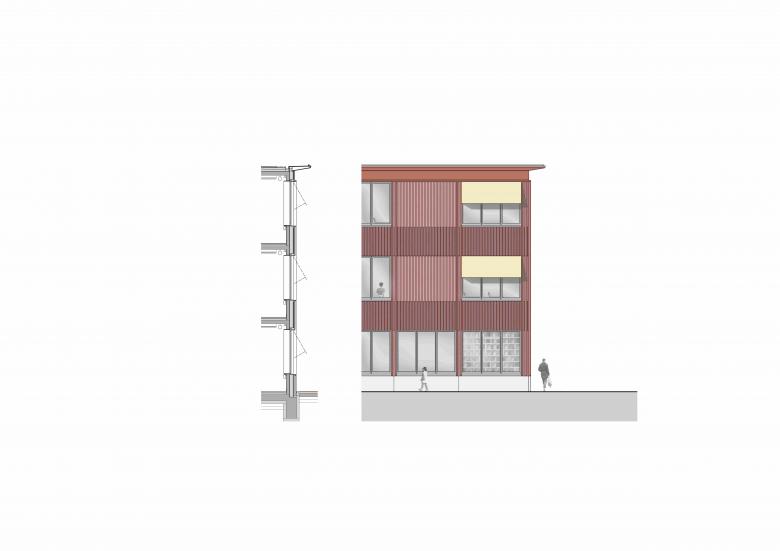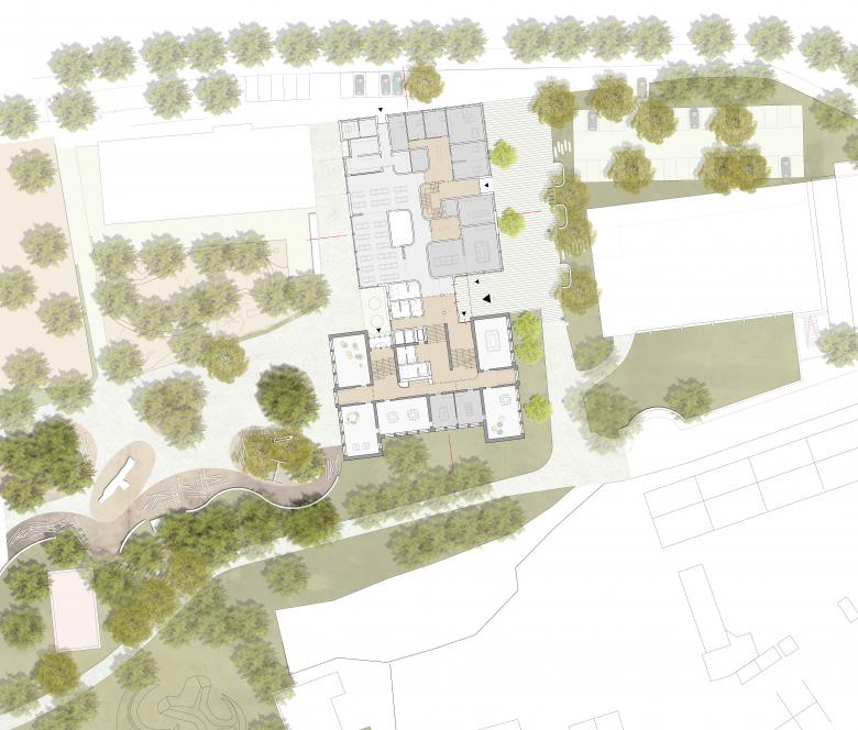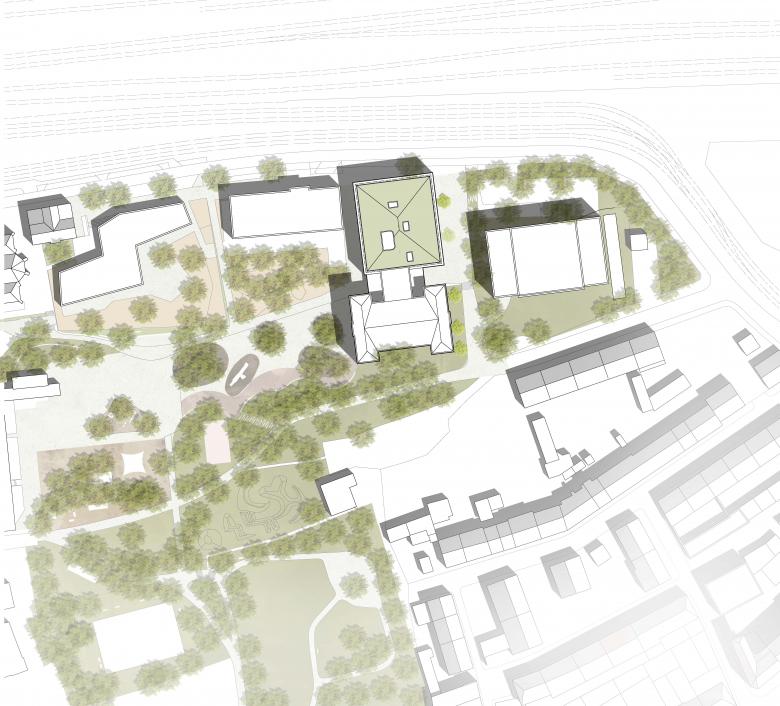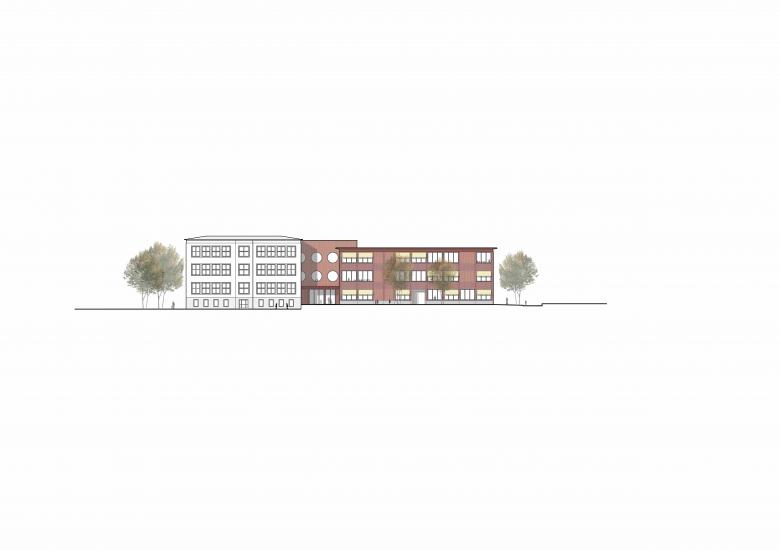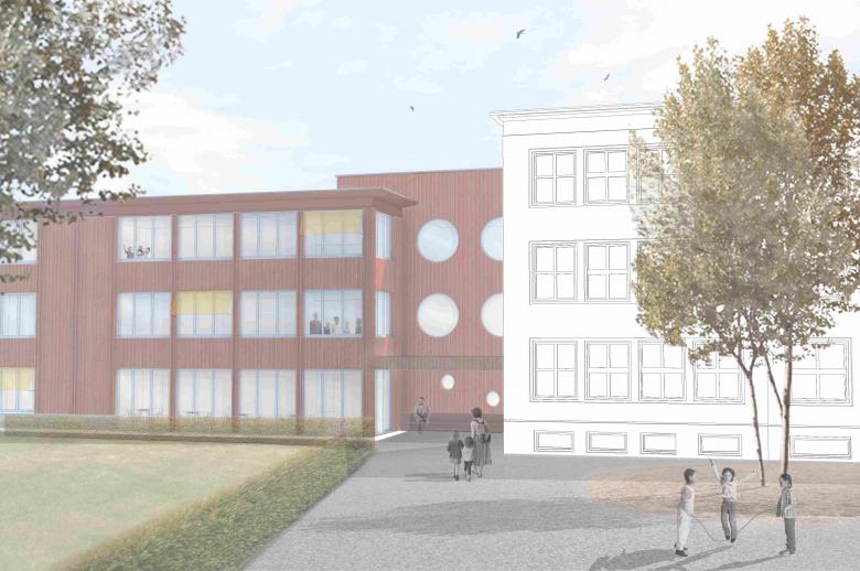 Mit dem vorliegenden Entwurf haben wir uns entschieden, die Bestandsstruktur wertzuschätzen und im wirklichen Sinne weiterzubauen. Der Neubau wird unter Berücksichtigung zeitgemäßer Materialien und Konstruktionsweisen mit dem Bestehenden verschmolzen. Die Übernahme bewährter Architekturmotive wie das auskragende Dachgesims und die Bullaugen trägt zur Bildung eines identitätsstiftenden Ensembles auf dem Kirchberg bei.