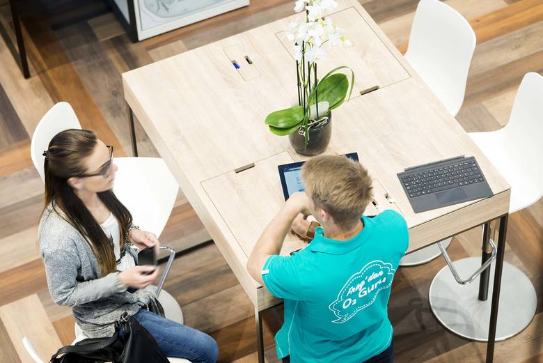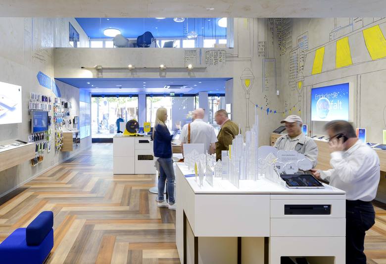 Der 250 qm große Store strukturiert sich in drei ineinandergreifende Zonen: Disrupt, Deliver und Discover. Disrupt steht für Inspiration und Aufladung – diese erfolgt im Eingangsbereich des Stores. Deliver bedeutet vor allem Beratung – in dieser Zone stehen O2 Gurus zur intensiven Kundenbetreuung Rede und Antwort. Im Discover-Bereich sind unterschiedliche Produktwelten inszeniert, die der Kunde allein, oder mit Begleitung erkunden, erleben und ausprobieren kann.