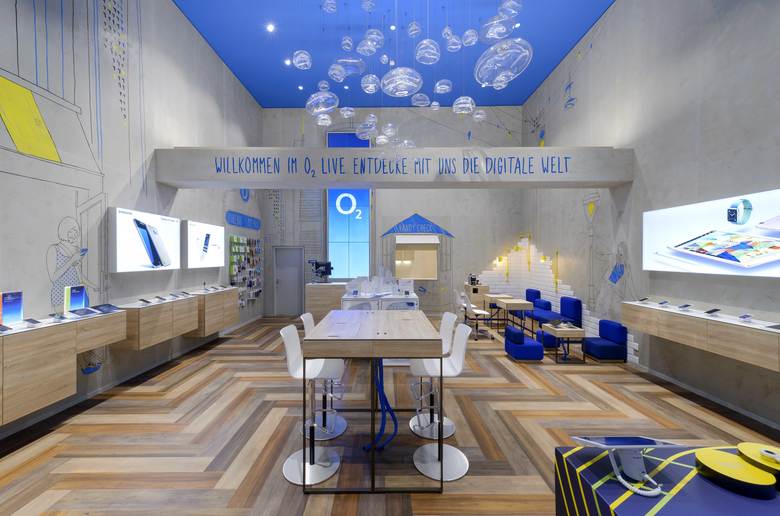Der Flagship Store fungiert als Bindeglied von Marke und Stadt, besonders die handgemalten Wandgrafiken und die mundgeblasene Glaskörper-Installation machen den O2 Live Store, unabhängig von seinen innovativen digitalen Momenten, zu einem Unikat. Die Skyline Frankfurts, ergänzt durch urbane Objekte und Menschen, als illustratives Element, bringt auf ihre Weise eine typische Regionalität in den Raum. Die schwebenden Glaskörper, in Anlehnung an aufsteigende Luftblasen, greifen das ursprüngliche Markenelement von O2 auf.