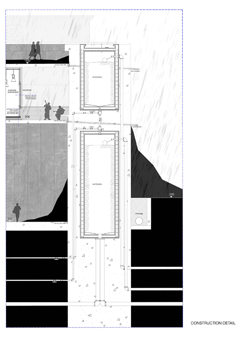 This building is a linear interference in the existing landscape. The alternating walls and columns rise up from the ground. Due to the rising sea level the flood risk after a storm increases tremendously. Therefore buffer basins are integrated in the thickness of the walls. The space in between the walls is empty. Emptiness stimulates creativity. What if a refugee gets the opportunity to play the main role in a new metro pole of subcultures? As the sand blows trough the openings, the building is permanently in alteration. The hollowness is filled by sand, as the refugees gently continue their travel. Before summer arrives we use the captured sand to reconstruct the Belgian beaches.