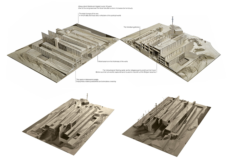 The project site is situated at the seafront of Ostend. The city is struggling with infrastructural problems due to the rising sea level. But the sea also opens up perspectives for an increasing amount of refugees. The citadel of tides unites the cultural and pragmatic necessary aspects. It is our responsibility to open up the eyes to the mutual benefits.
