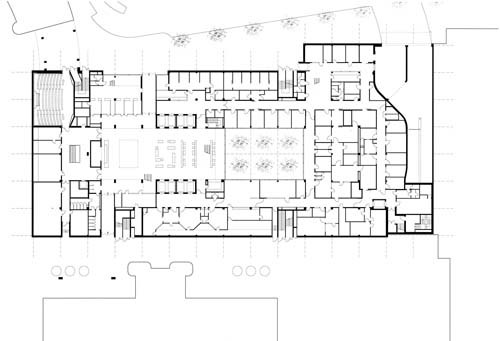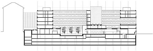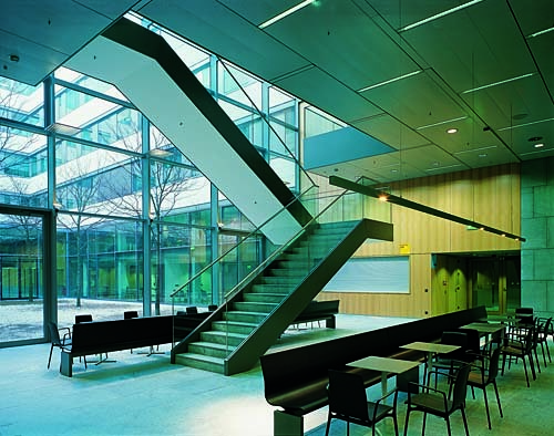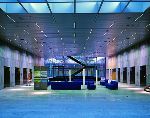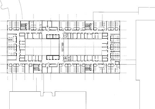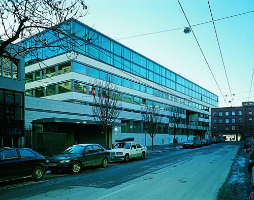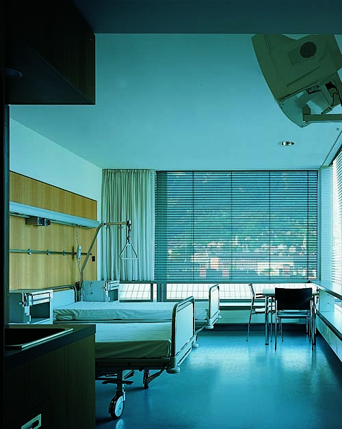 Das Projekt versucht, im Gegensatz zur allgemeinen Tendenz der 60er und 70er Jahre, fast alle Räume natürlich zu belichten. Dies nicht nur für die ständig in diesem Objekt Arbeitenden von Vorteil, sondern dient vor allem als Instrument der Reduktion der Angst der Patienten vor der "Blackbox-Intensivmedizin". Räumlich ist das Projekt so aufgebaut, daß in einer ring- oder schleifenförmigen Anordnung der Räume eine offene Mitte - ein begrünter Hof - liegt, in dem zentral pavillonartig die Foyerbereiche angeordnet sind.