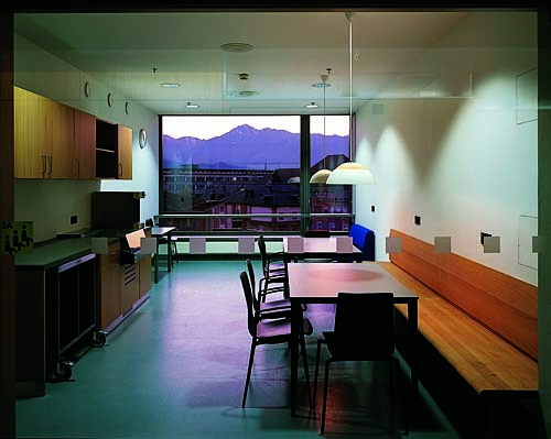 Durch die Gleichartigkeit der Fassaden wird die schon jetzt vorhandene, sehr sympathische Wahrnehmung des Spitals als Teil des Stadtraumgewebes noch verstärkt. Durch die forcierte Verwendung von Holz und Farbe wird eine nicht institutionelle Atmosphäre erzeugt.