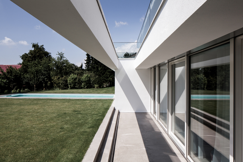 So entstand ein radikales und kompromissloses Spiel zwischen Öffnen und Schließen. Eine konsequente Geschlossenheit zeigt der minimalistische Baukörper zur Straße hin, zu der er sich einzig durch die Haustüre und die Garage öffnet und somit die Privatsphäre der Bauherren schützt und behütet. Offenheit und Transparenz dagegen prägen das Gebäude zum Garten hin, wo eine 18 m lange Highend-Glasfassade den Blick in die Natur und den Pool freigibt.