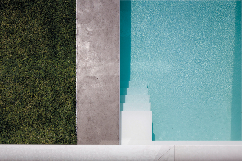 Der eigenwillig in die Fassade geschobene Pool ist mit Solartechnik ausgestattet und zusätzlich über einen Wärmetauscher an die Luft-Wasser-Wärmepumpe der Haustechnik angeschlossen. Er kann somit ganzjährig geheizt und genutzt werden. In den Grundriss integriert grenzt der Pool unmittelbar an das Schlafzimmer und den Wellnessbereich und verzahnt somit Innen und Außen. Die Lichtreflexionen an Wänden und Decken sind darüber hinaus ein wunderbares Gestaltungselement