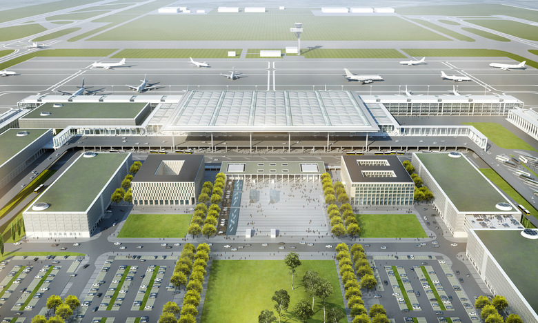 Durch die Schließung des Flughafens Berlin-Tegel steht 2012 die Eröffnung des neuen Berlin-Brandenburger Flughafens bevor. Eine Mittelachse des parallelen Start- und Landebahnsystems in Ost-West-Richtung ist das „Rückgrat“ der Flughafenanlage. Sie ordnet die Haupterschließungselemente. Der neue Fluggasterminal besteht aus einer Haupthalle und vorgelagerten Piergebäuden. Er ist in zwei Ebenen geteilt, so dass auf der Landseite eine Trennung von Ankunft und Abflug erfolgt. Die Abflugebene als Hauptebene ist als großzügige, lichte Halle konzipiert, die mit einer filigranen Stahl-Glas-Konstruktion überspannt wird. Der Terminal greift mit seinen gegliederten Fassaden und klaren, geometrischen Formen architektonische Elemente von Schinkel bis Bauhaus auf.