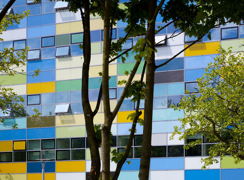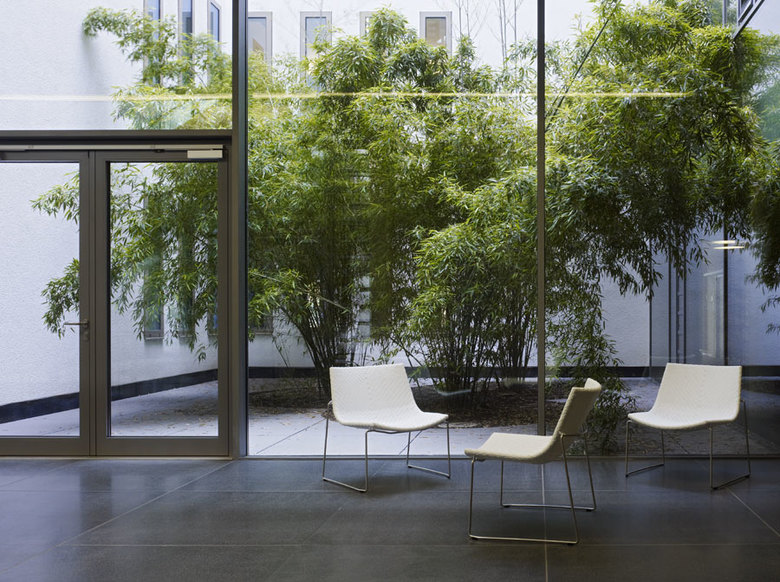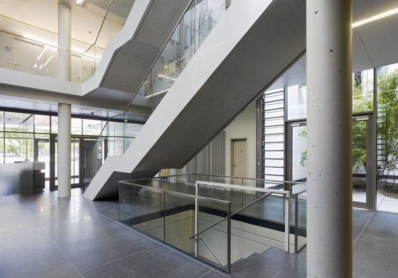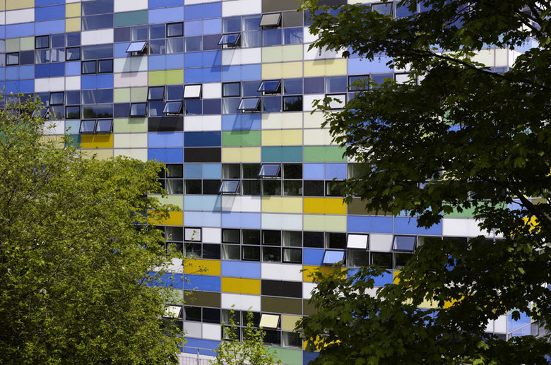 Die Gliederung der Fassade folgt dem Konzept der Gleichwertigkeit aller Mieteinheiten. Die homogene, zelluläre Struktur der Fassade umhüllt das Volumen mit einer, die unterschiedlichen Ebenen überspielenden Haut. Die innere und äußere Gestaltung thematisieren das spannungsreiche Spiel zwischen einem zusammenhängenden Mieter-Zentrum einerseits und seinen individuellen Nutzern andererseits.