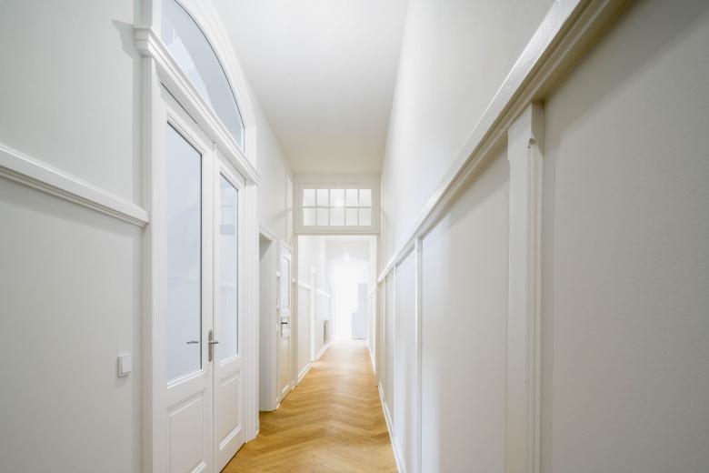 In den beiden neuen Wohnungen entstanden großzügige und lichte Räume mit offenen Wohn- und Wohnküchenbereichen. Einheitliche Eichenholzböden und -treppen sowie die farbliche Gestaltung der Wände in hell abgestuften Grautönen lassen ein durchgehendes Raumkontinuum entstehen. Farblich abgestimmte Terrazzo- und Zementfliesen in den Küchen, Bädern und auf den Treppenhauspodesten schaffen historischen Bezug. Sockelleisten, Lamperien und Stuckaturen wurden baugleich ergänzt. Neue schlichte weiße Einbauschränke und klassische Heizungsverkleidungen verfeinern das Ambiente und erzeugen eine sinnliche Eleganz.