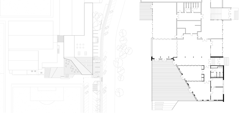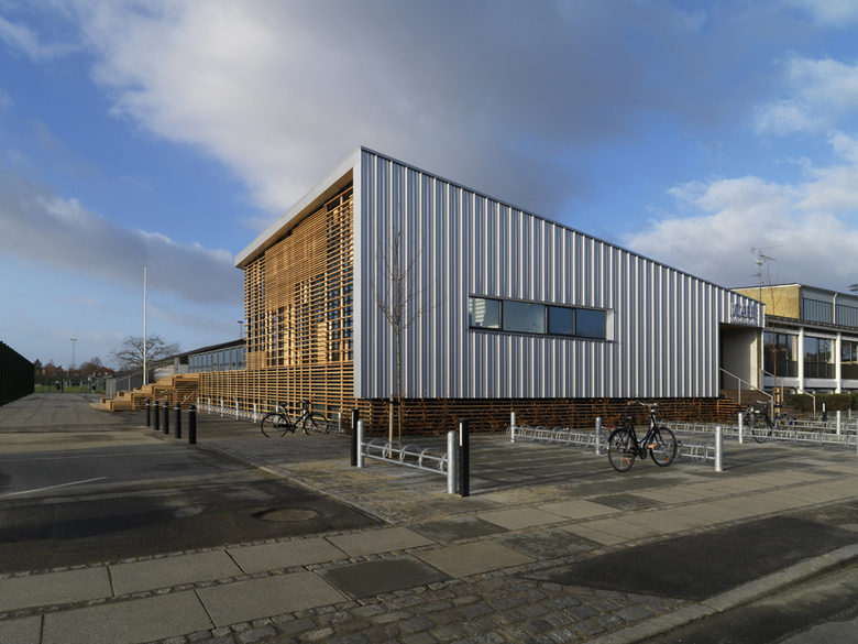 The materials are limited to aluminium and timber. The aluminium continues the material and volumes of the existing sports facilities and wraps the roof with two of the three facades. In contrast, timber is employed where the form is cut away, providing necessary sun shading to meet energy requirements, and for the terrace and steps connecting to the playing fields. The timber sun shading slats refers to wall bars in gymnastic halls and tie the steps into the volume of the building. In addition, the slats screen the changing rooms’ windows to provide privacy yet natural daylight. The closed façade elements and the internal window mullions are also timber products.