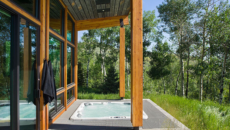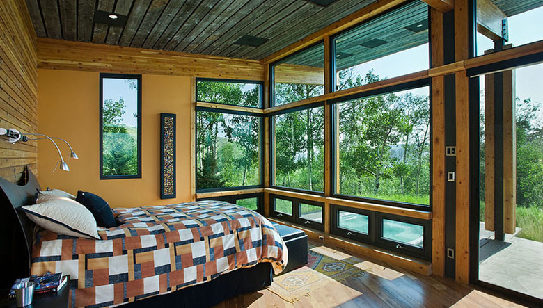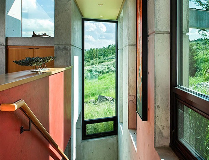 More subtle transparency occurs through honest structural elements and materials that clearly expose form. The residence’s “no-nonsense” nature is revealed in an unashamed use of exposed concrete; simple horizontal, natural-weathering, untrimmed cedar siding; and imperfect reclaimed wood. Wood and concrete flow from exterior to interior across low-profile windows, erasing the natural-to-created space distinction, while structural steel columns and concrete flying buttress-like supports visually continue interior structure outdoors.