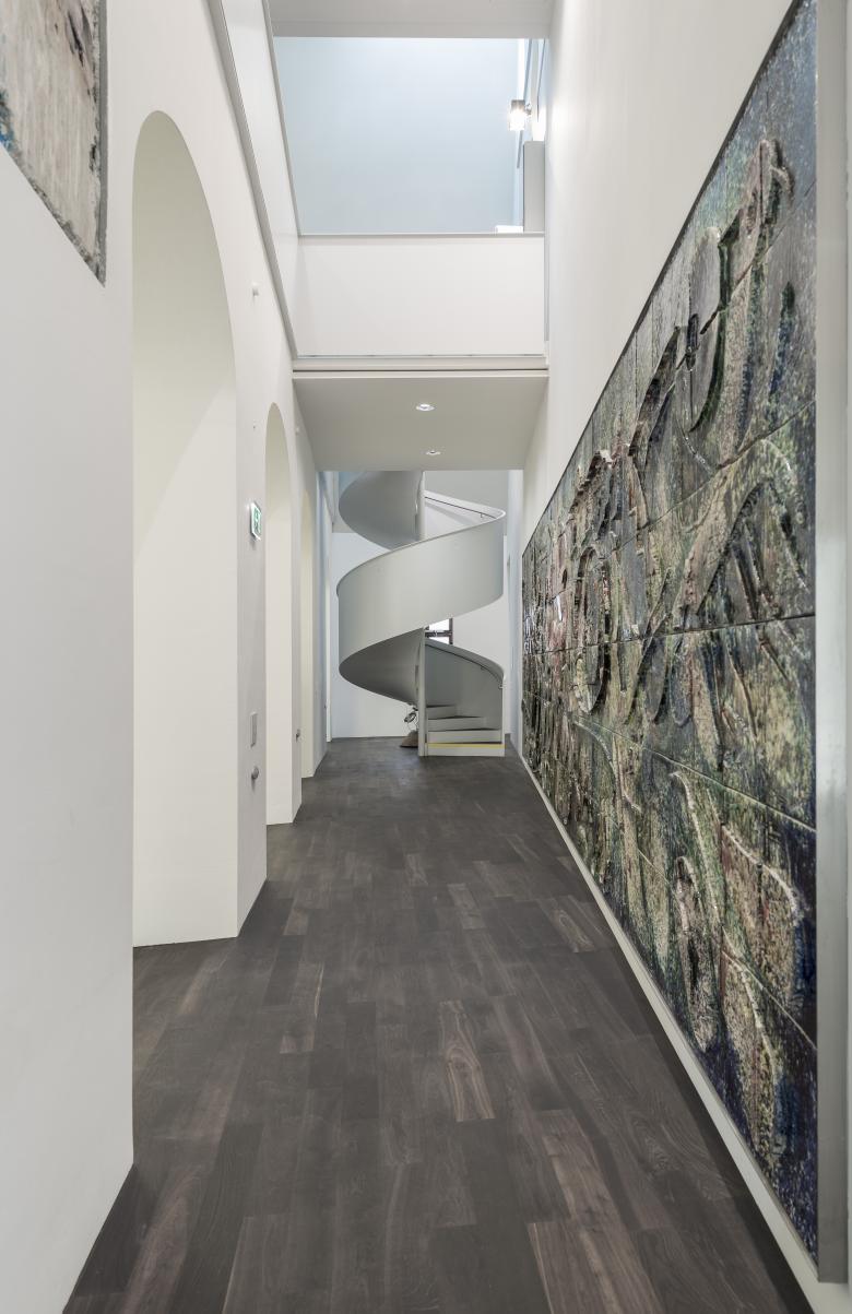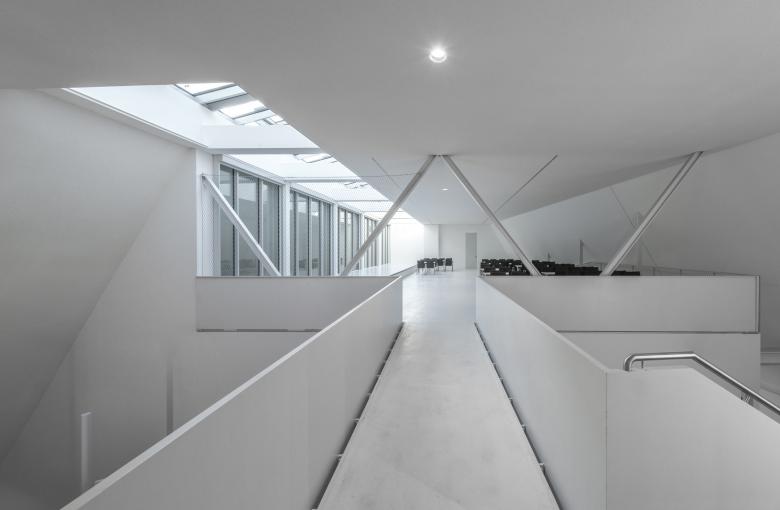 Durch das Verschwenken des Saales parallel zur Fassade entsteht eine Erweiterung des Foyers. Eine mobile Verbindung zwischen den beiden Räumen soll die Kapazität und die Nutzungsmöglichkeiten erweitern. Als zusätzliche Option kann der Dachraum über dem Saal als Austellungsraum genützt werden. Über einen Wintergarten der über den Dachfirst belichtet ist, wird einerseits der Ausstellungsraum und andererseits die Belichtung des Saales erreicht.