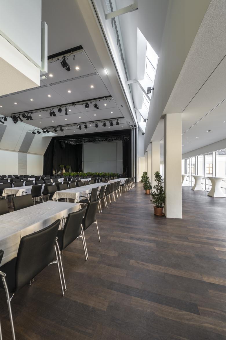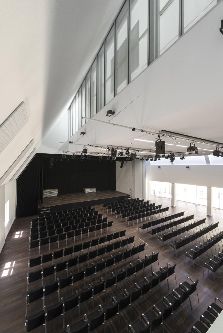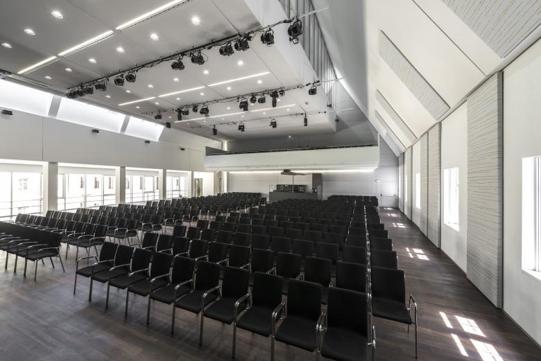 Um einen optimalen Mehrzweckraum zu erreichen wurde eine rechteckige Saalform