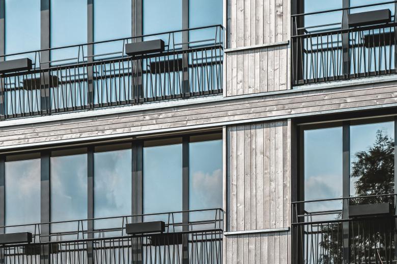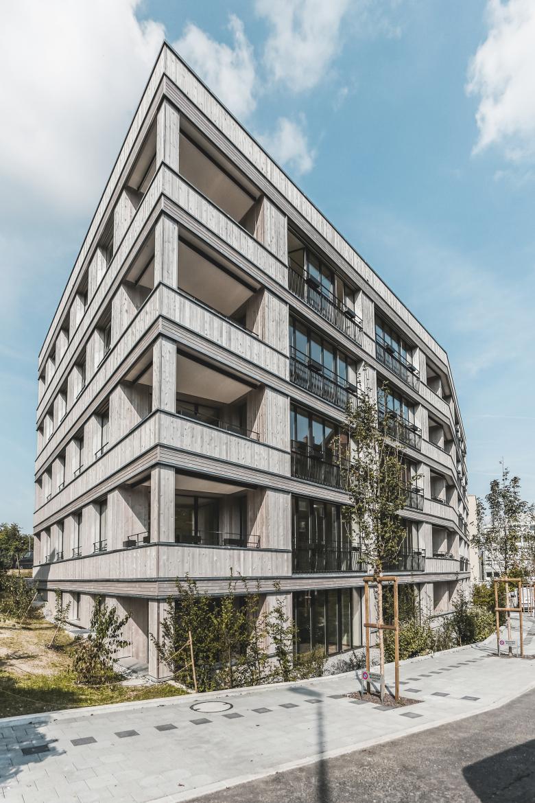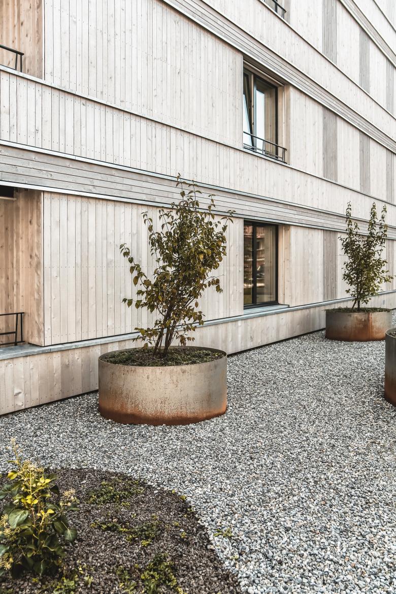 Die Fassade ist klar strukturiert und ist in einer druckimprägnierten, vorvergrauten Holzfassade ausgeführt. Horizontale und vertikale Fassadenteile gliedern die Fassade und brechen die Höhe in der Wahrnehmung. Die im Kontrast stehenden Fenster und Geländer verleihen dem gesamten Bau eine vornehme Zurückhaltung. Die Ausgestaltung der Geländer stehen im Gegensatz zu der strengen Ordnung der Gesamtfassade. Das gewählte Farb-/und Materialkonzept unterstreicht den Kontext eines Stadthauses und verleiht dem ganzen Quartier eine schlichte Eleganz.