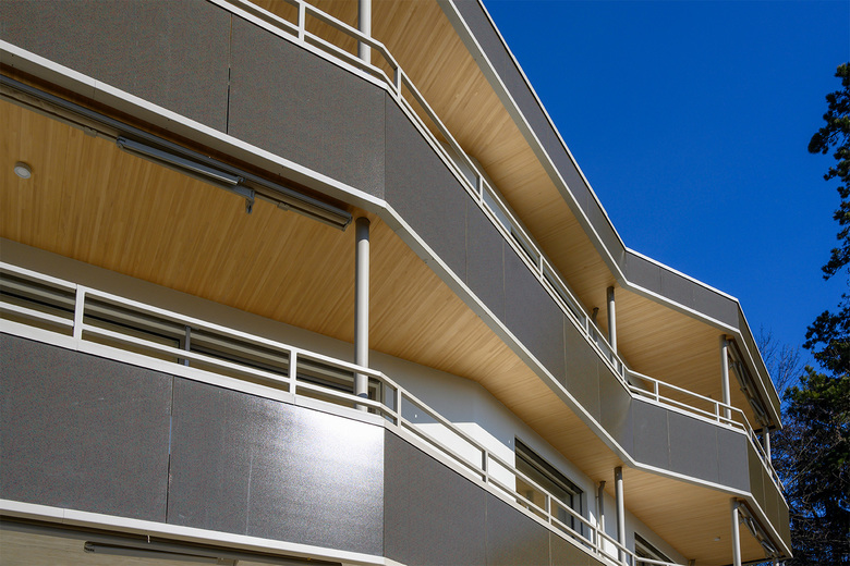 Als Material für Fassaden und Balkonbrüstungen werden Photovoltaikmodule aus Glas eingesetzt, die in einem kleinteiligen Raster zu 50 % farbig bedruckt sind. Unterschiedliche Farben werden sich optisch zu einem Grüngrau vermischen. Auch die Dachfläche ist vollständig mit Photovoltaik belegt. Zusammen mit Wärmepumpe und Erdsonden wird eine Nullenergiebilanz erreicht.