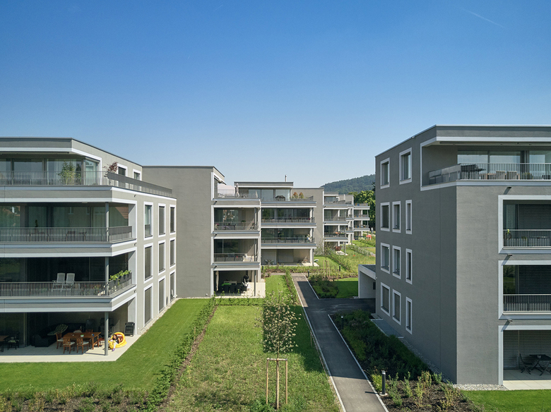 Die sechs Mehrfamilienhäuser mit insgesamt 45 Einheiten wurden als Zweispänner geplant. Auf den drei Regelgeschossen befinden sich je eine 4 1/2 und eine 3 1/2 Zimmer Wohnung. Das Attikageschoss ist wahlweise mit zwei 2 1/2 oder einer 5 1/2 Zimmer Wohnung belegt. Die Kubatur der Gebäude wurde so gewählt, dass jede Wohnung ihre eigene Ausrichtung und somit ihre Privatsphäre erhält. Die Staffelung ermöglicht eine optimale Besonnung sämtlicher Wohnungen.