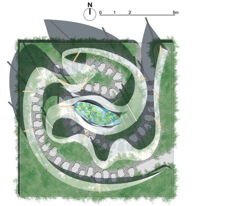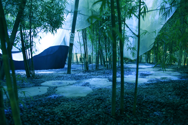 White veil twines ring upon ring and winds through green bamboos, where a garden of hearts lies. Its mystery seduces people rambling into it to explore something. Setting against the gray gravel pavement and green bamboo, this cloudlike veil is of transcendent purity, and its mazy space guides its appreciator gradually away from the secular society and into this Zen garden. Through various twists and turns, and even confusion looms, people finally come to the center of the garden. In the middle of the dancing white veil is a peaceful water pool, with beautiful lotus in full bloom, pure, lovely and nice-smelling. The mirror-like pool reflects the lotus, green bamboo and white veil, as if there is another world in the water. Not only in the pool, the lotus blossoms also in the heart of each person, bringing people a quiet, touched and insightful mind. Still tortuous the path to leave is, people already find their inner peace and calm away from the secular worries. Looking back, this utopia world disappears in a mist. While the people, in the quiet time, will miss the lotus in their hearts.